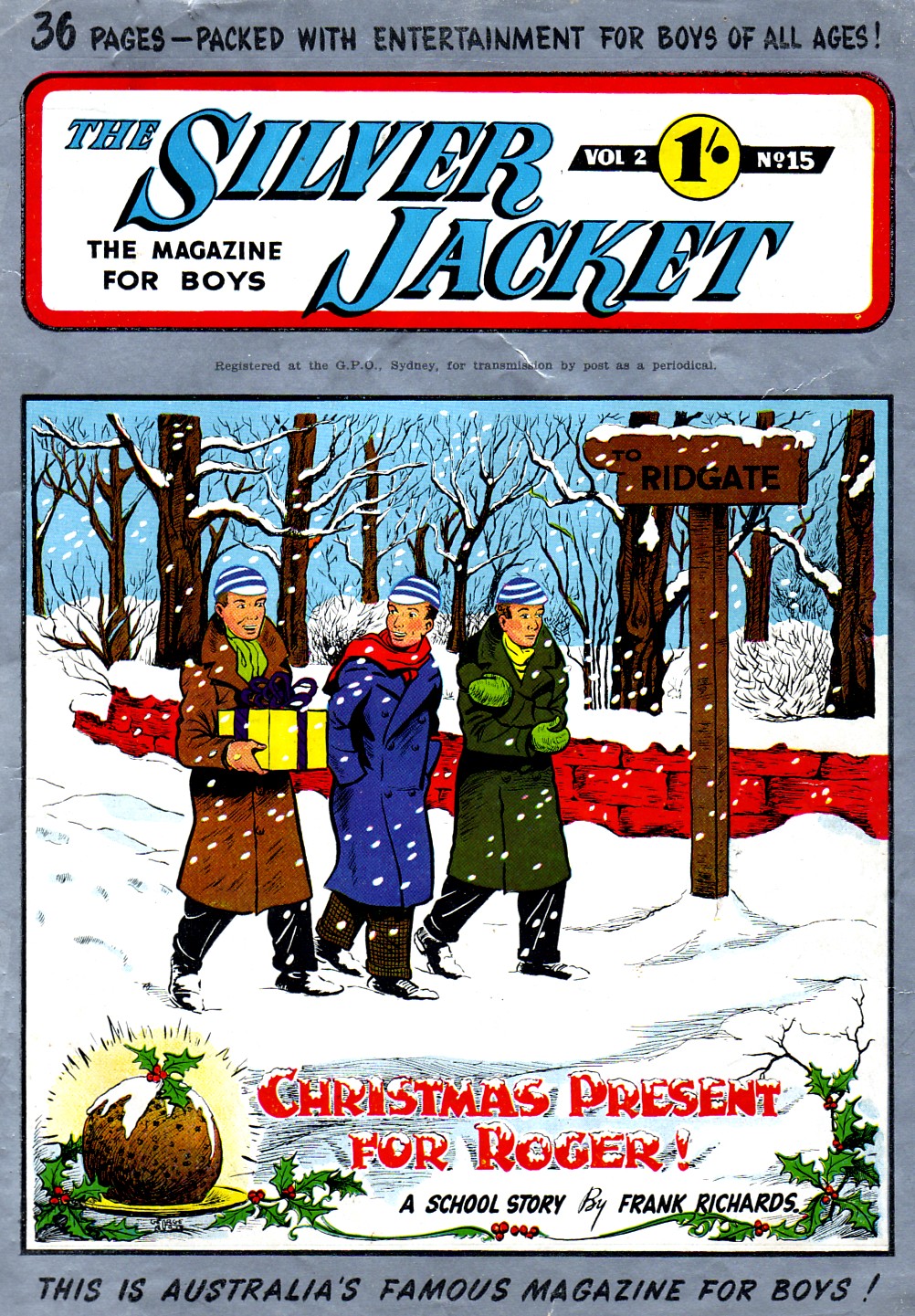 The Silver Jacket was published in Australia by Arthur Gorfain of Beaconsfield Publications and was published monthly from 1953-1955. The publisher originally wanted to print Greyfriars stories but Richards was not allowed to use the characters as they were still under copyright from Amalgamated Press. Instead 27 Carcroft stories were published, ten of them being reprints from Hutchinson's Pie and the rest original. 38 issues of the Silver Jacket were published but only the first 27 issues contained Frank Richards material.