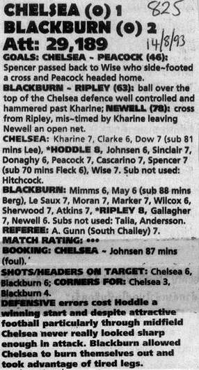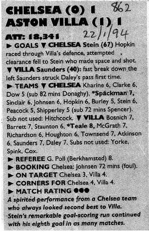 | 14/08/1993 | Blackburn | Report | 22/01/1994 | Aston Villa | Report |