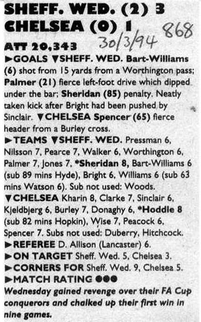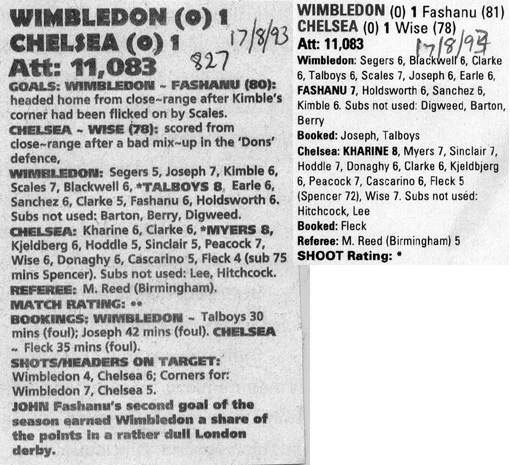 | 17/08/1993 | Wimbledon | Cutting | 29/01/1994 | Sheffield W | Report |