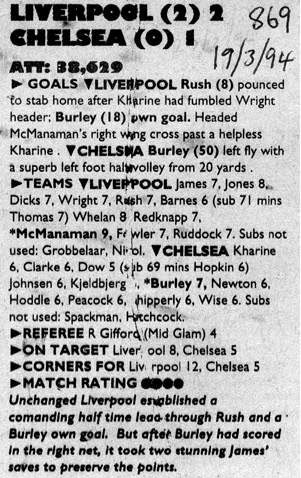| 25/09/1993 | Liverpool | Cutting | 05/03/1994 | Manchester U | Report |