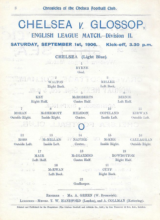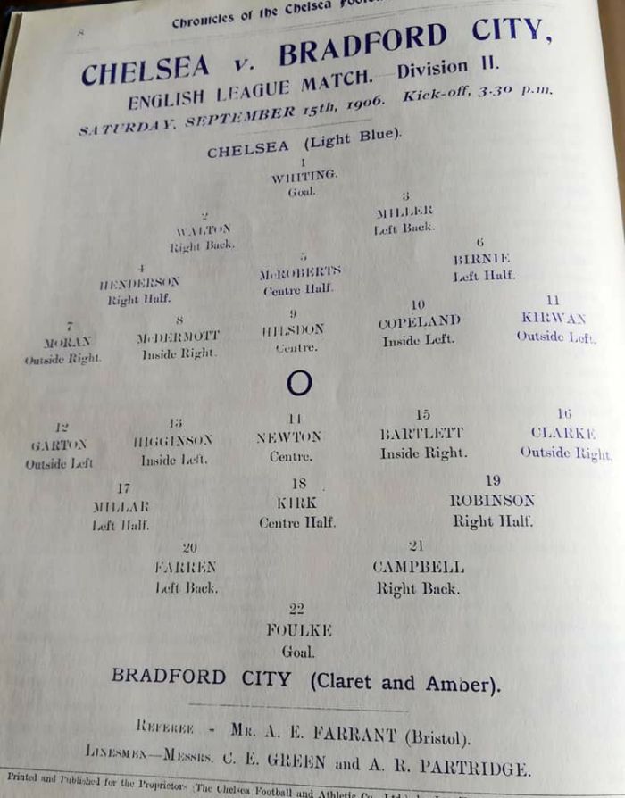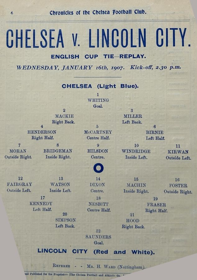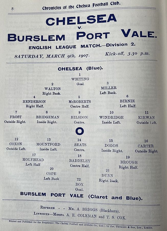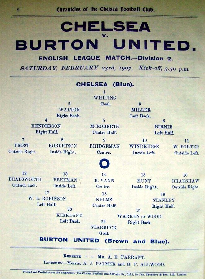 1 Bob Whiting, 2 Joseph Walton, 3 Thomas Miller, 4 George Henderson, 5 Bob McRoberts, 6 Ted Birnie, 7 Martin Moran, 8 Tommy McDermott, 9 George Hilsdon, 10 David Copeland, 11 James Windridge |