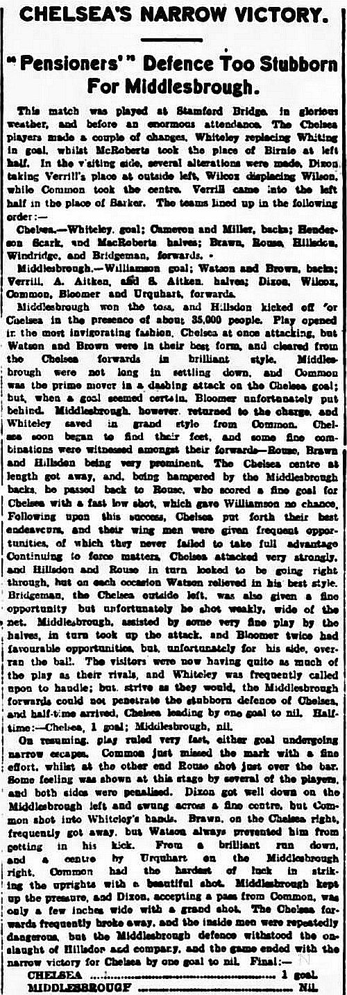 1 Jack Whitley, 2 Jock Cameron, 3 Thomas Miller, 4 Bob McRoberts, 5 James Stark, 6 Ted Birnie, 7 Billy Brawn, 8 Percy Humphreys, 9 George Hilsdon, 10 James Windridge, 11 Norman Fairgray |