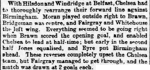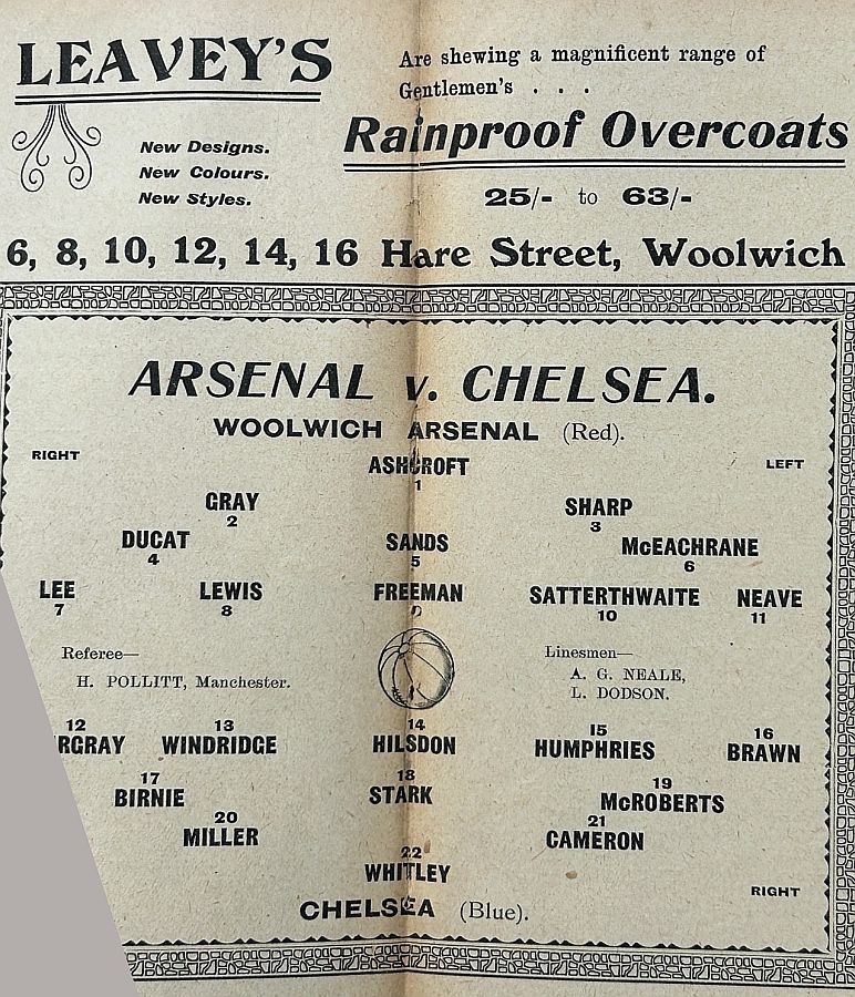 1 Jack Whitley, 2 Frank Lyon, 3 Jock Cameron, 4 Bob McRoberts, 5 James Stark, 6 Ted Birnie, 7 Billy Brawn, 8 Percy Humphreys, 9 George Hilsdon, 10 James Windridge, 11 Norman Fairgray |