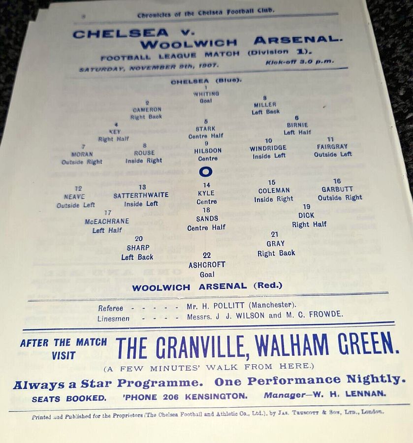 1 Jack Whitley, 2 Jock Cameron, 3 Frank Lyon, 4 Bob McRoberts, 5 James Stark, 6 Ted Birnie, 7 Billy Brawn, 8 Percy Humphreys, 9 George Hilsdon, 10 James Windridge, 11 Norman Fairgray |
