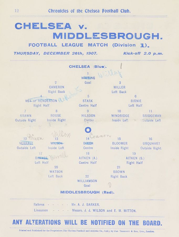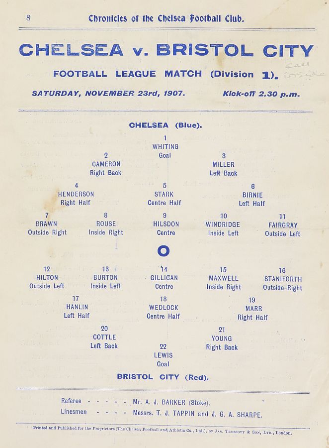 1 Bob Whiting, 2 Joseph Walton, 3 Thomas Miller, 4 George Henderson, 5 Bob McRoberts, 6 Ted Birnie, 7 Jimmy Frost, 8 William Bridgeman, 9 George Hilsdon, 10 James Windridge, 11 Jack Kirwan |