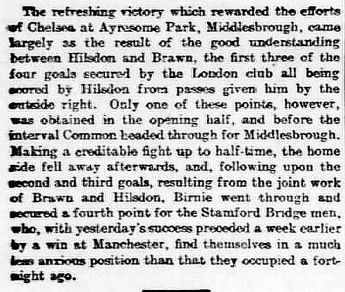 1 Jack Whitley, 2 Jock Cameron, 3 Bill Cartwright, 4 Ben Warren, 5 Sam Downing, 6 Ted Birnie, 7 Billy Brawn, 8 Percy Humphreys, 9 George Hilsdon, 10 James Windridge, 11 Charlie Freeman |