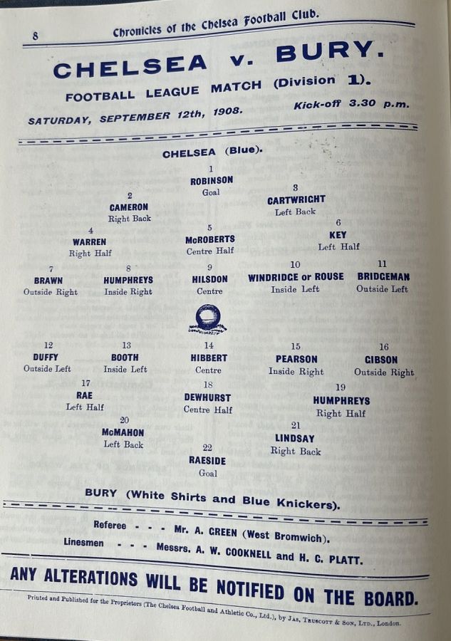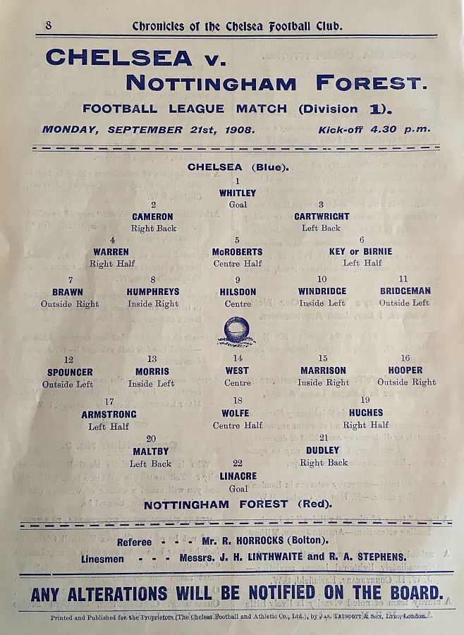 1 Arthur Robinson, 2 Jock Cameron, 3 Bill Cartwright, 4 Ben Warren, 5 Bob McRoberts, 6 George Key, 7 Billy Brawn, 8 Percy Humphreys, 9 George Hilsdon, 10 Fred Rouse, 11 William Bridgeman |