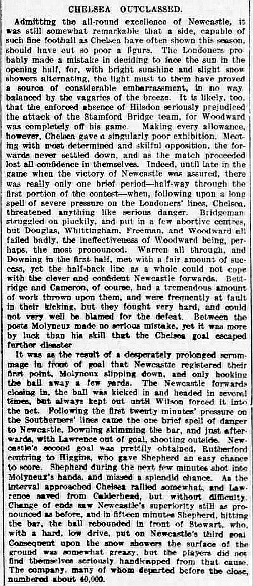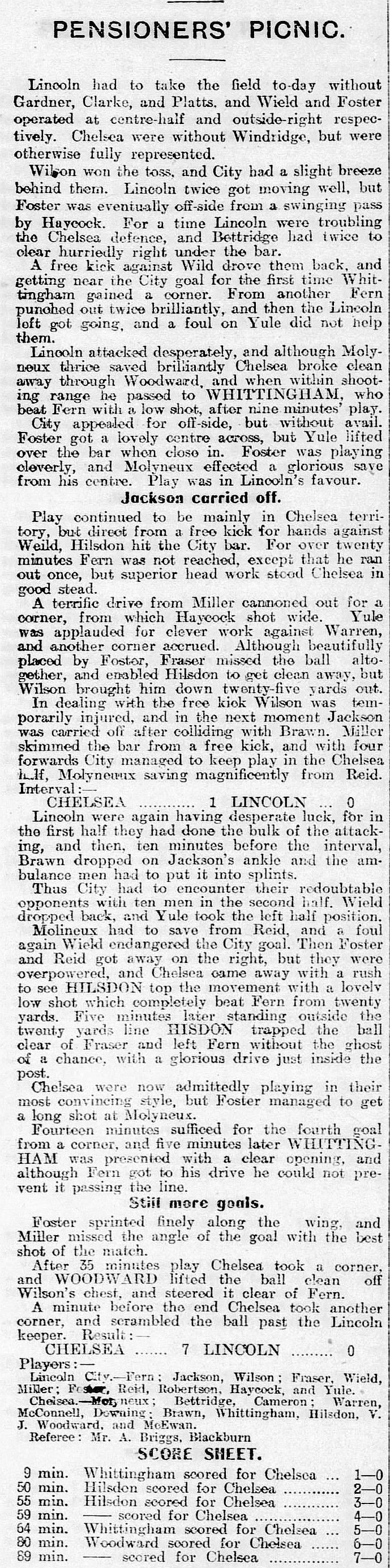 1 James Molyneux, 2 Wally Bettridge, 3 Jock Cameron, 4 Frederick Taylor, 5 Andy Ormiston, 6 Sam Downing, 7 Billy Brawn, 8 Bob Whittingham, 9 Vivian Woodward, 10 Charlie Freeman, 11 Norman Fairgray |