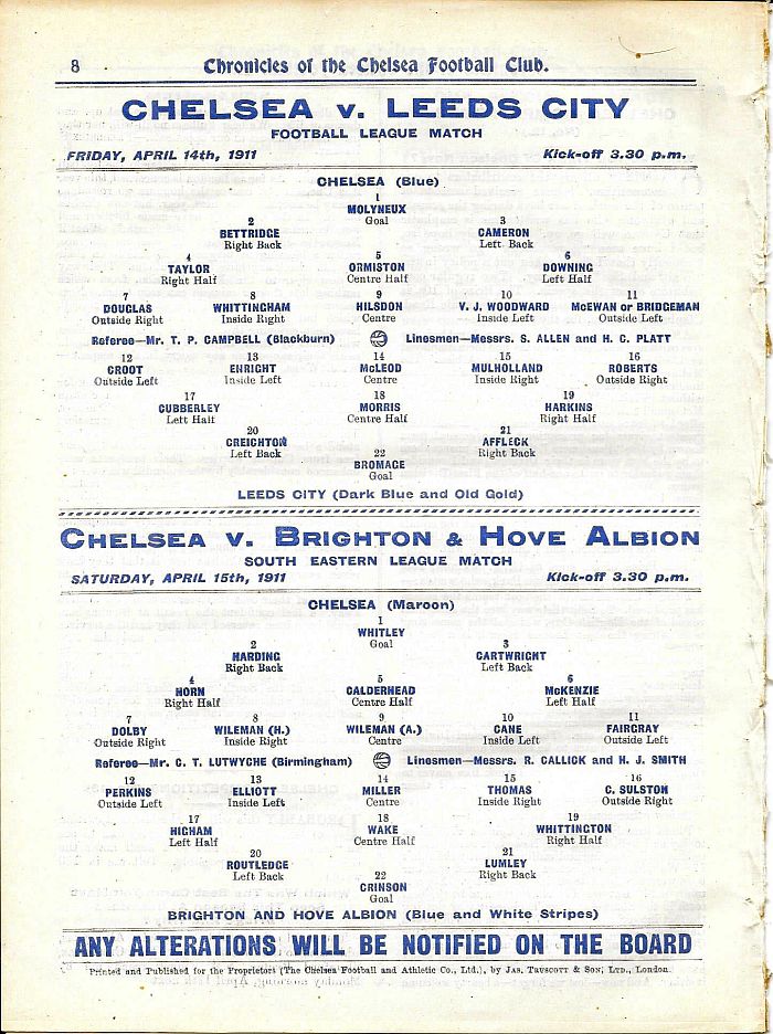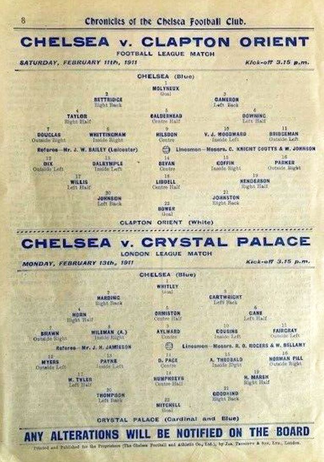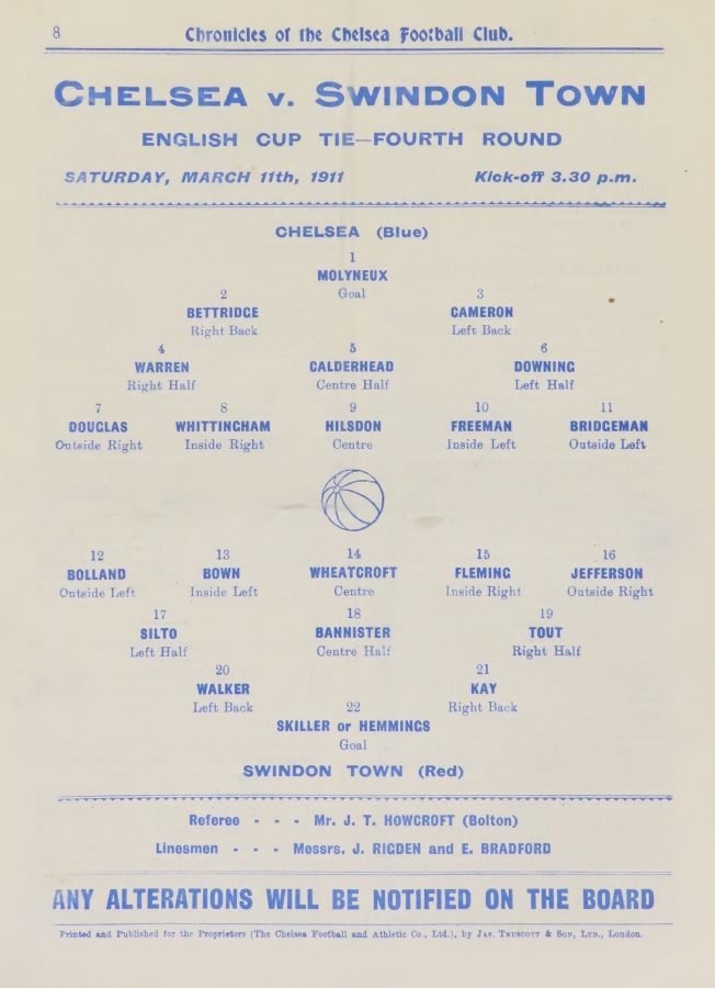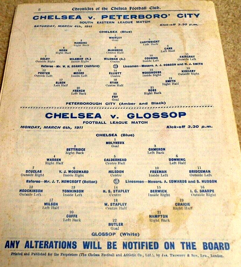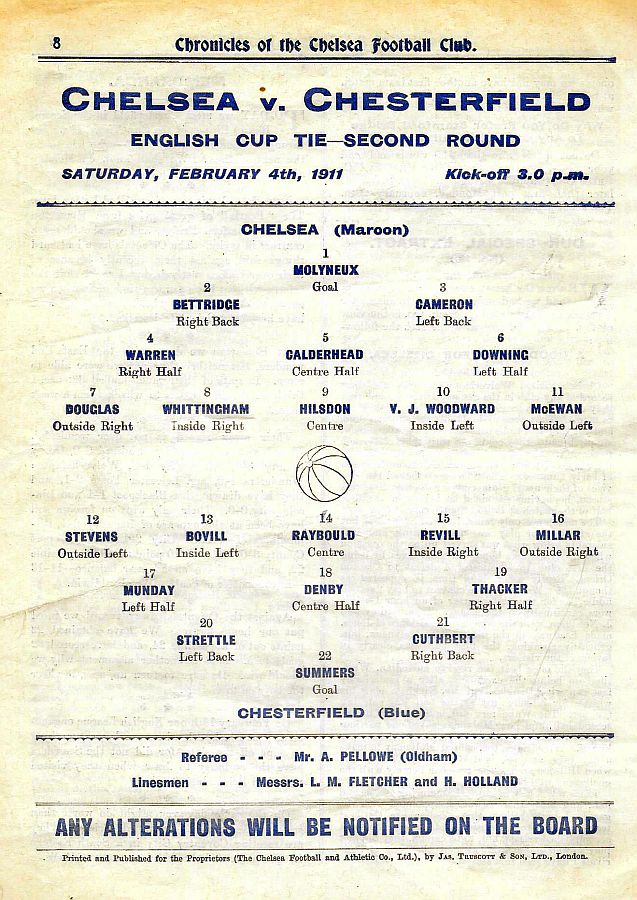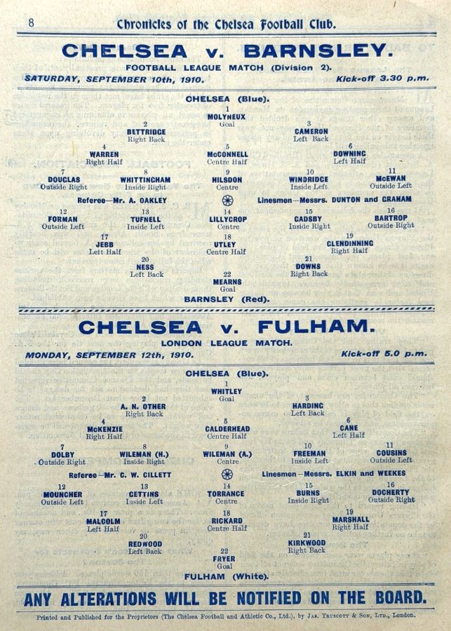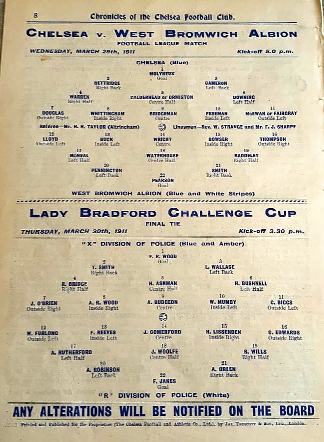 1 James Molyneux, 2 Wally Bettridge, 3 Jock Cameron, 4 Ben Warren, 5 English McConnell, 6 Sam Downing, 7 Billy Brawn, 8 Bob Whittingham, 9 George Hilsdon, 10 Vivian Woodward, 11 Marshall McEwan |