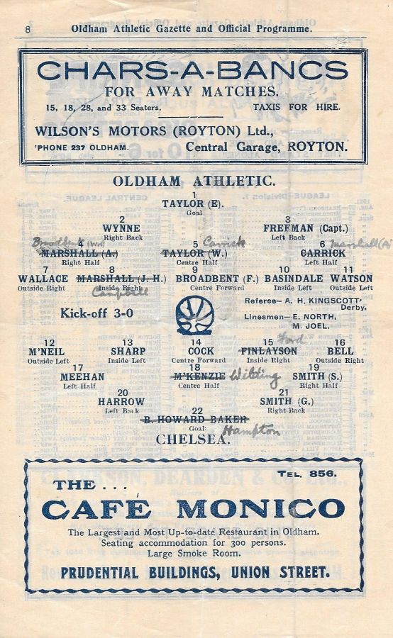 1 Colin Hampton, 2 Jack Harrow, 3 George Smith, 4 Tommy Meehan, 5 Harry Wilding, 6 David Cameron, 7 Frederick Linfoot, 8 William Haywood, 9 Jack Cock, 10 Buchanan Sharp, 11 Robert McNeil |
