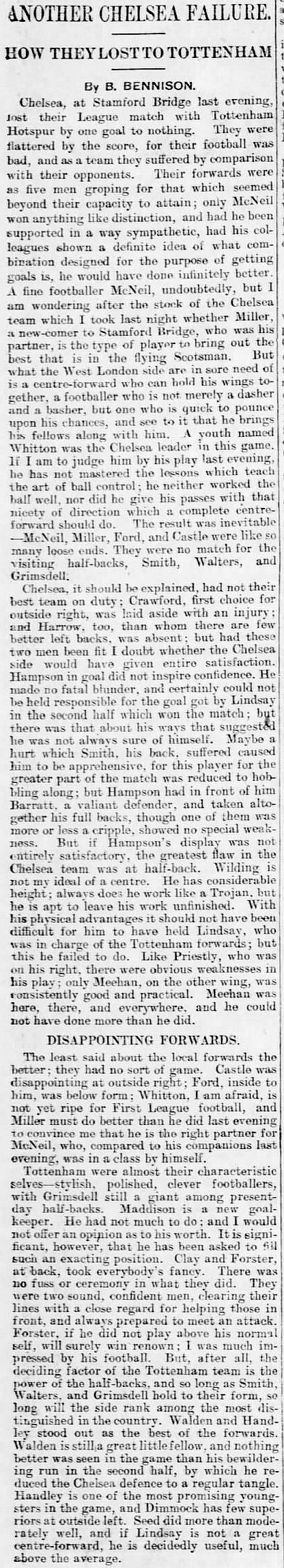 Geordie Maddison, Tommy Clay, Matt Forster, Bert Smith, Charlie Walters, Arthur Grimsdell, Fanny Walden, Jimmy Seed, Alex Lindsay, Charlie Handley, Jimmy Dimmock |