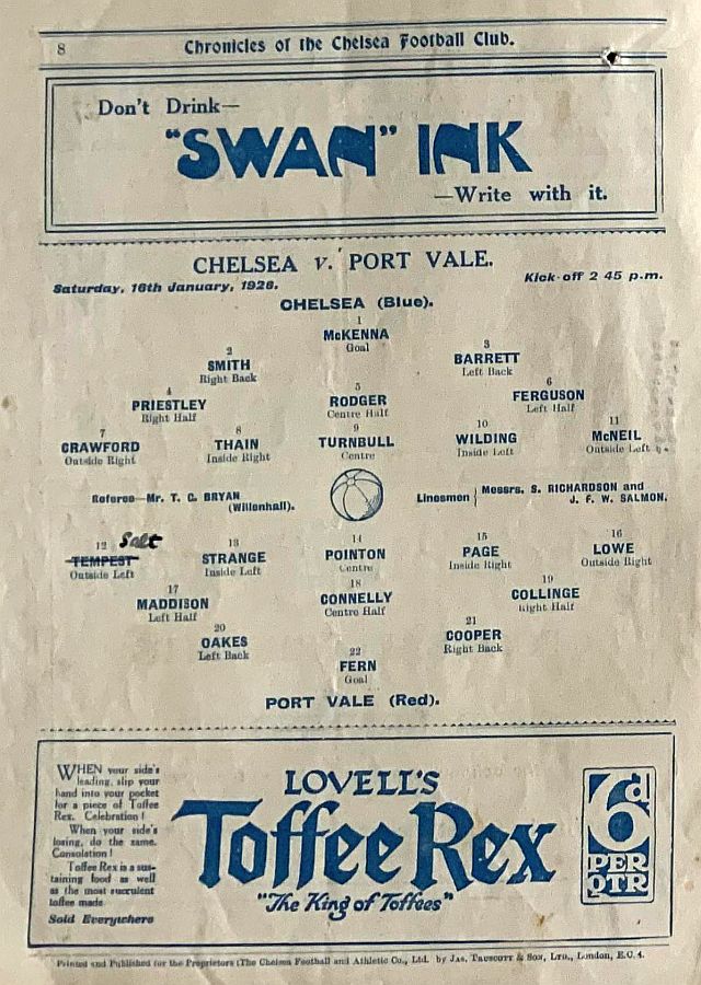 Tom Fern, Tommy Cooper, Jimmy Oakes, Billy Briscoe, Robert Connelly, Sidney Blunt, Jack Lowe, Tom Page, Wilf Kirkham, Alf Strange, Billy Tempest |