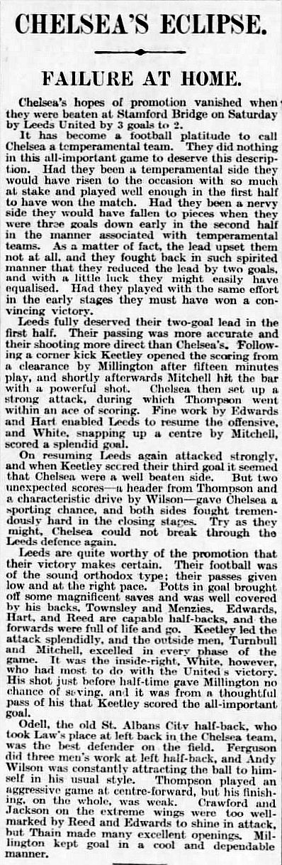 Jimmy Potts, Tom Townsley, Bill Menzies, Willis Edwards, Ernie Hart, George Reed, Bobby Turnbull, John White, Charlie Keetley, Russell Wainscoat, Tom Mitchell |