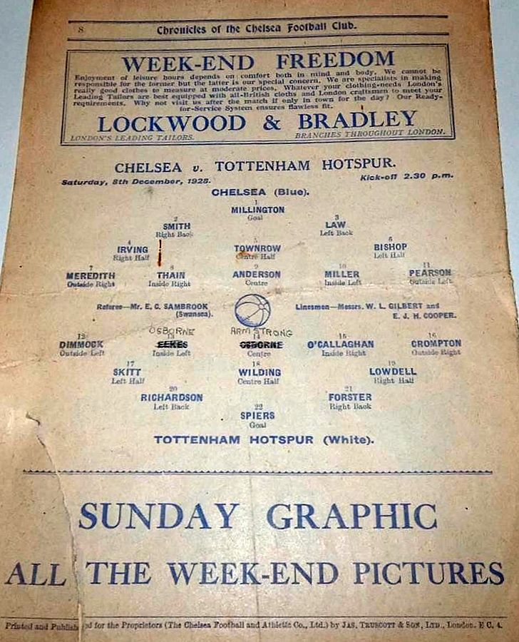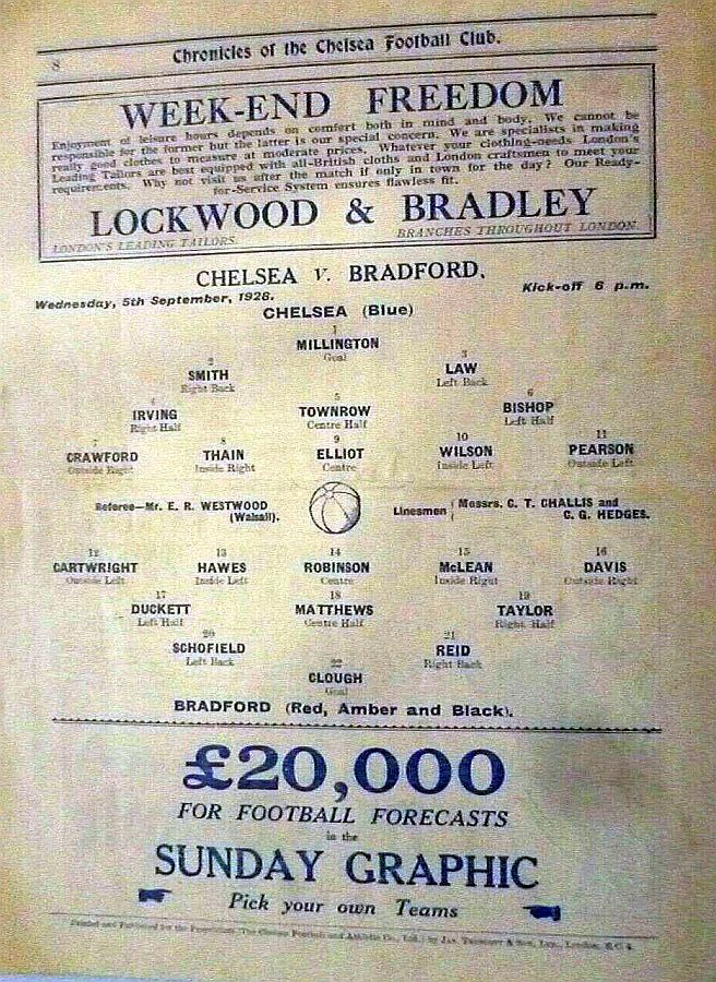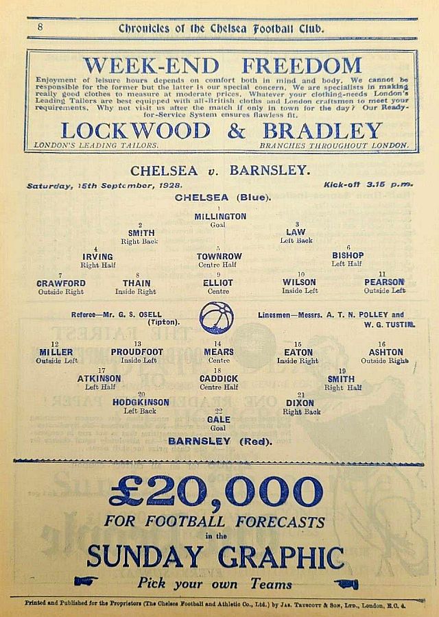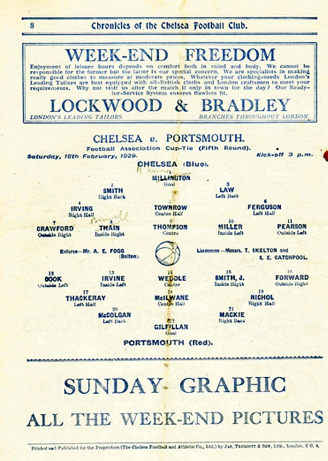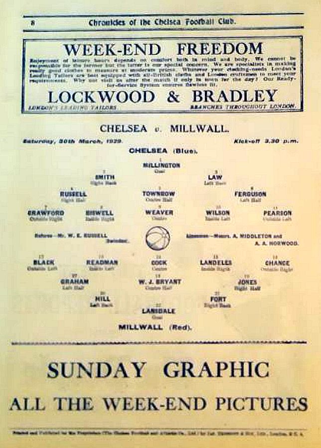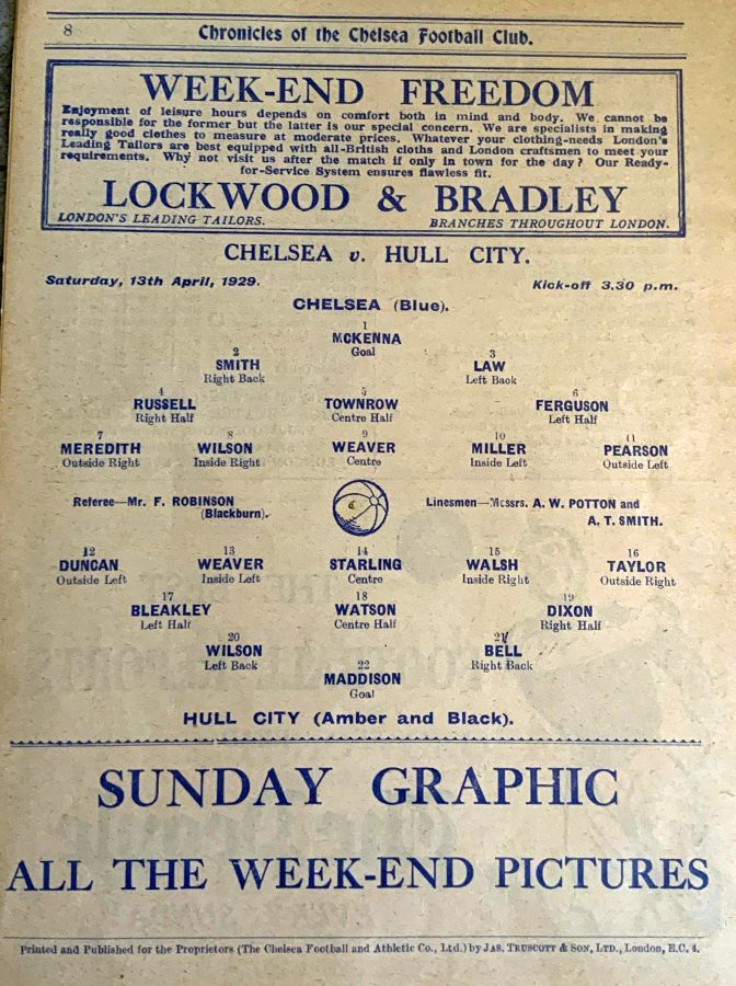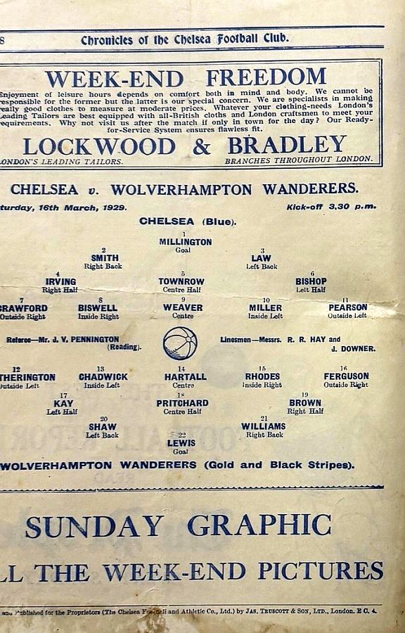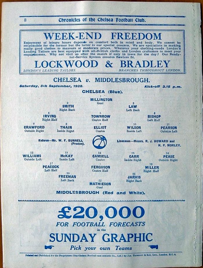 1 Sam Millington, 2 George Smith, 3 Tommy Law, 4 William Russell, 5 John Townrow, 6 Sid Bishop, 7 Jackie Crawford, 8 Reg Weaver, 9 Sidney Elliot, 10 Albert Thain, 11 Willie Jackson |