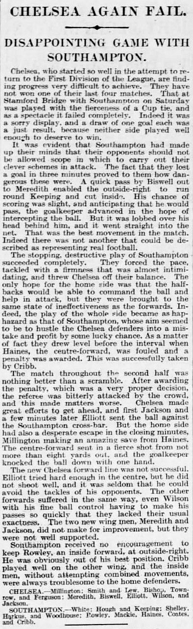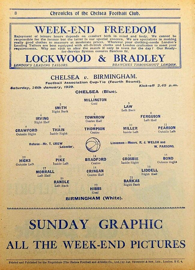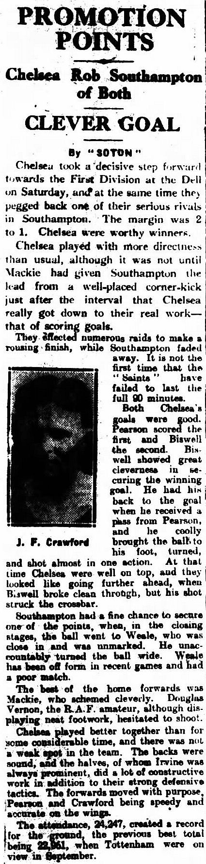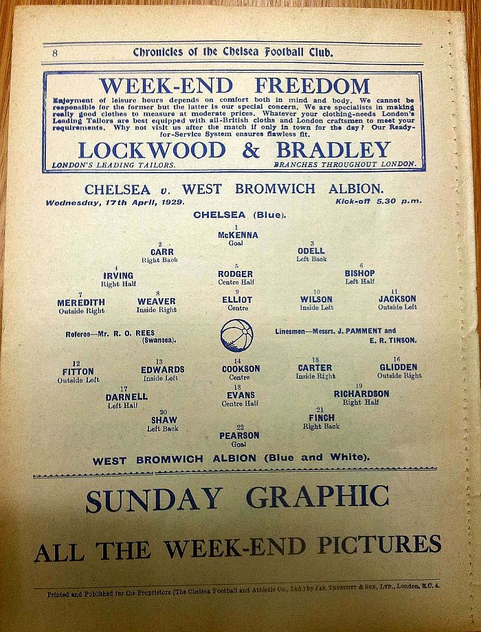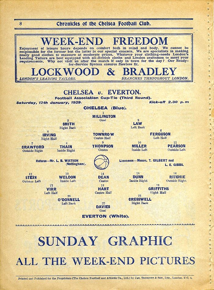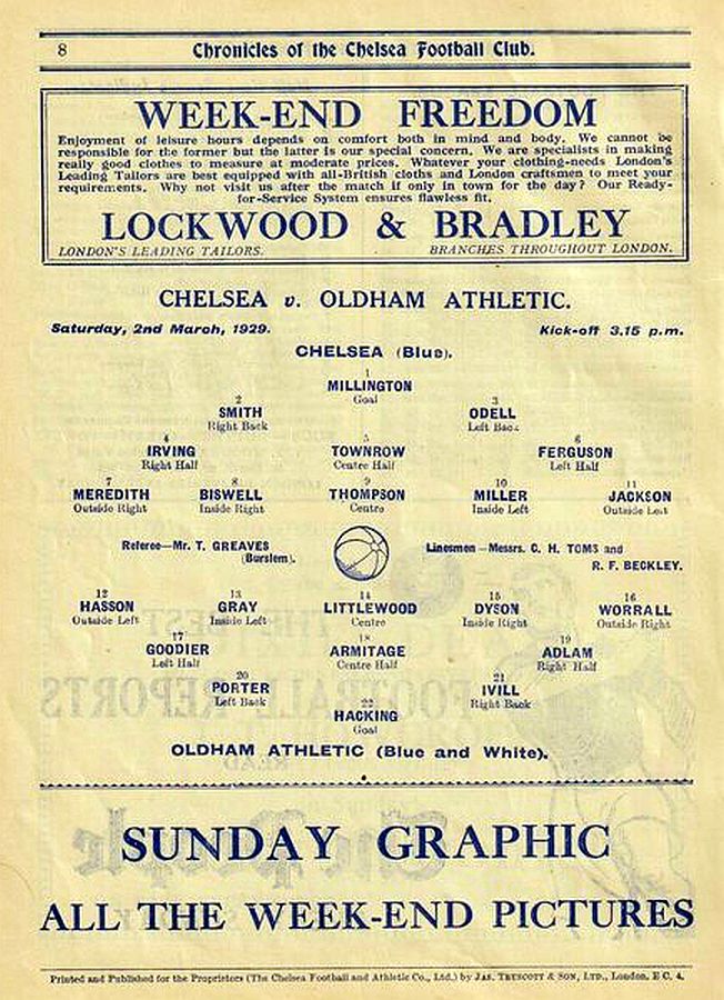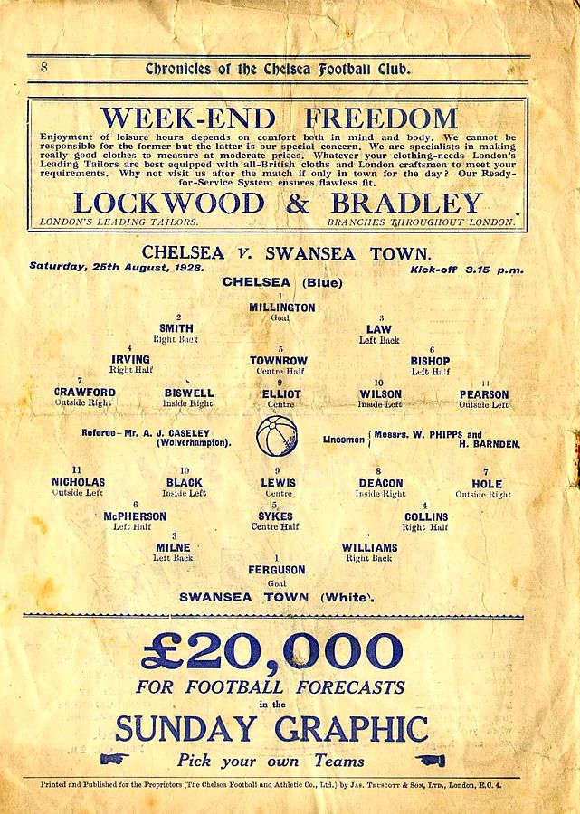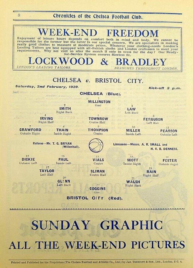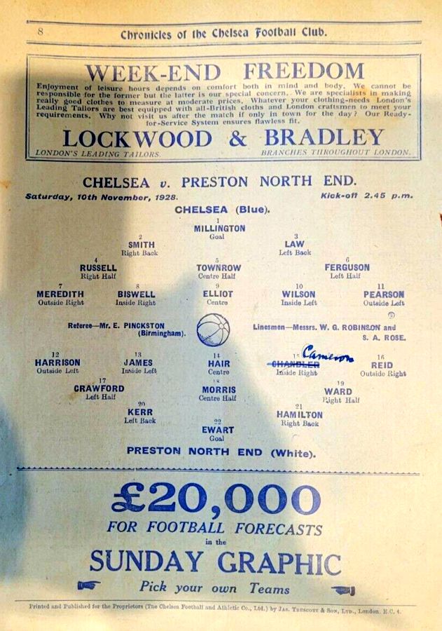1 Sam Millington, 2 George Smith, 3 Tommy Law, 4 William Russell, 5 John Townrow, 6 Sid Bishop, 7 Jackie Crawford, 8 Reg Weaver, 9 Sidney Elliot, 10 Albert Thain, 11 Willie Jackson |