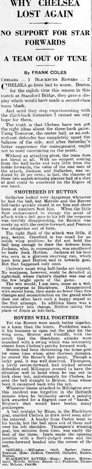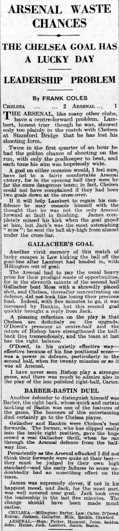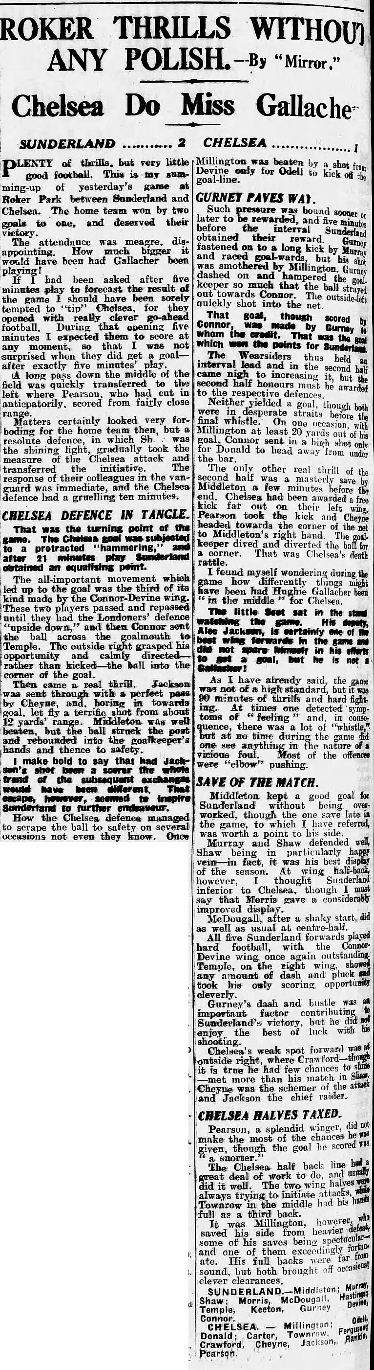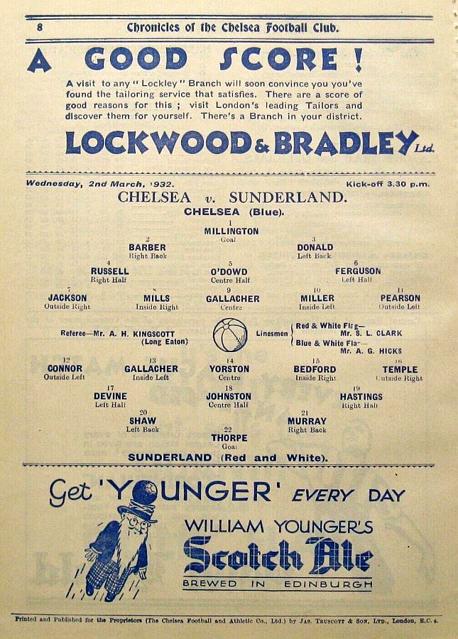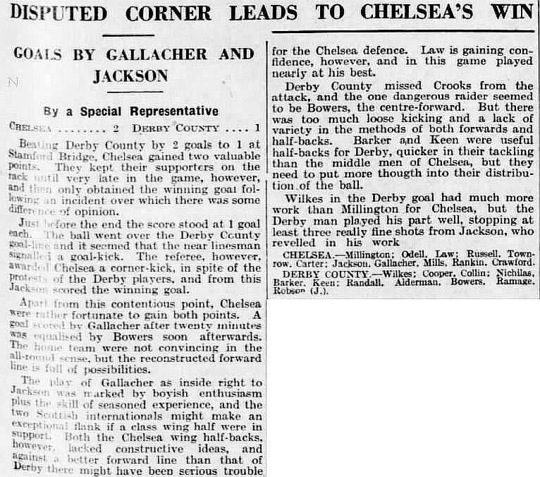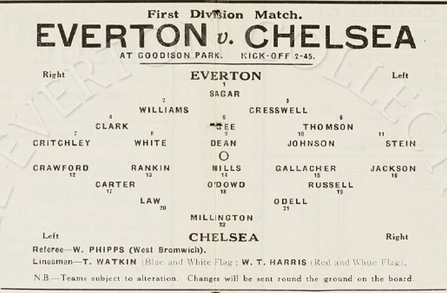 1 Sam Millington, 2 George Barber, 3 Tommy Law, 4 William Russell, 5 Peter O'Dowd, 6 Sid Bishop, 7 Jackie Crawford, 8 John Rankin, 9 Hughie Gallacher, 10 Harold Miller, 11 Wilf Chitty |