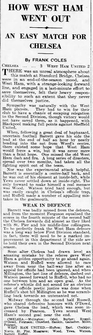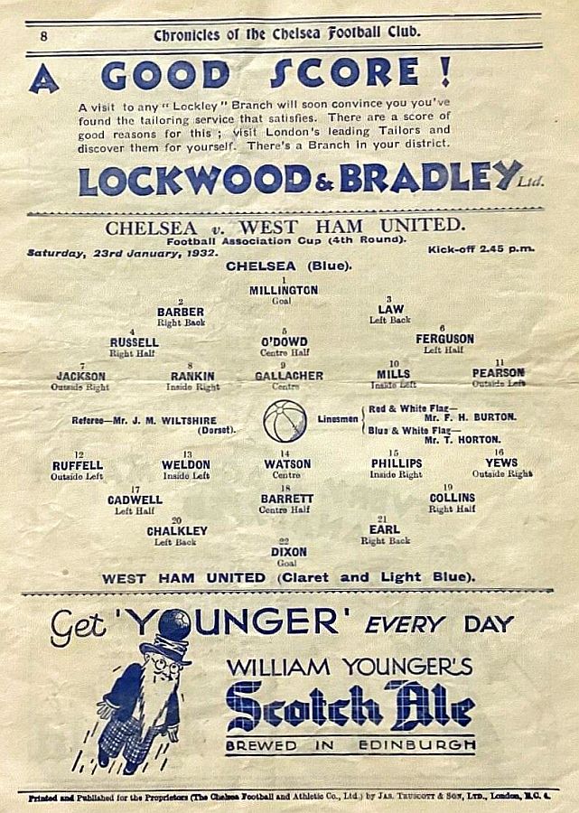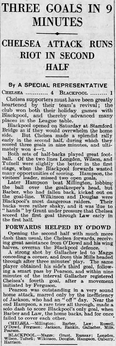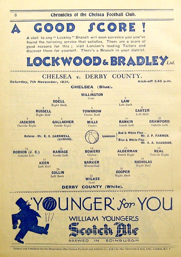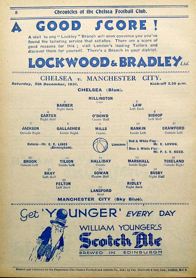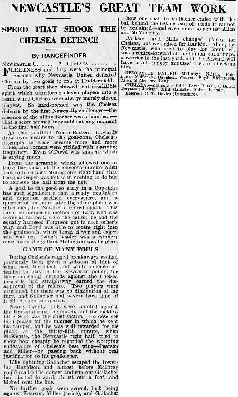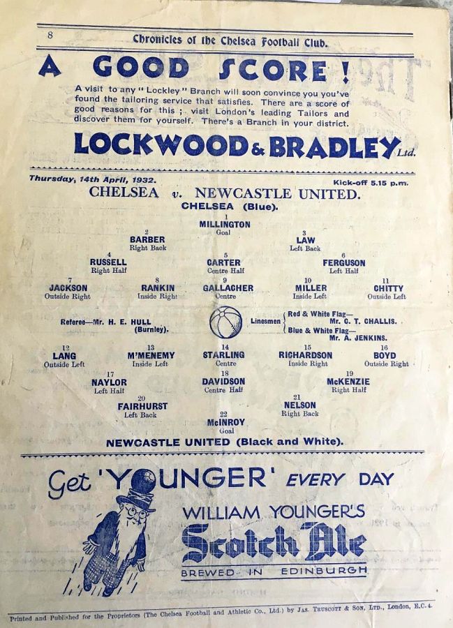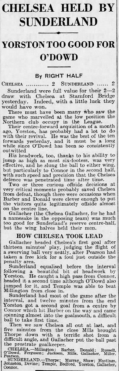 1 Sam Millington, 2 George Barber, 3 Tommy Law, 4 William Russell, 5 Peter O'Dowd, 6 Sid Bishop, 7 Jackie Crawford, 8 John Rankin, 9 Hughie Gallacher, 10 Harold Miller, 11 Wilf Chitty |