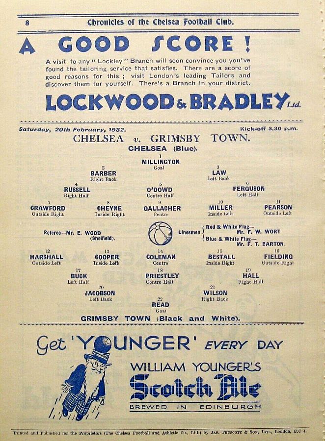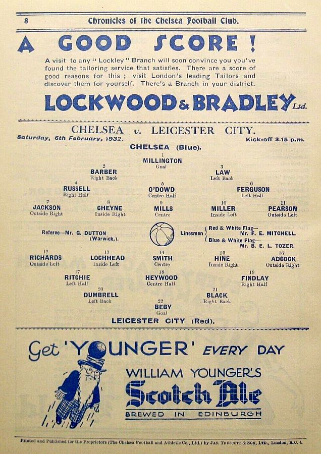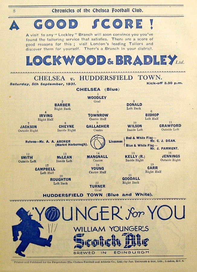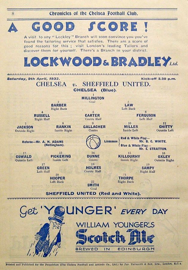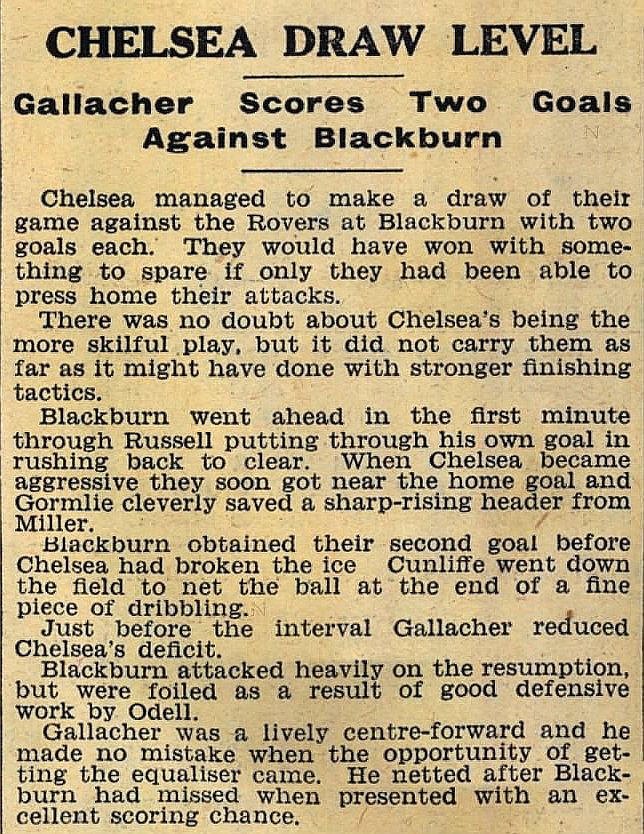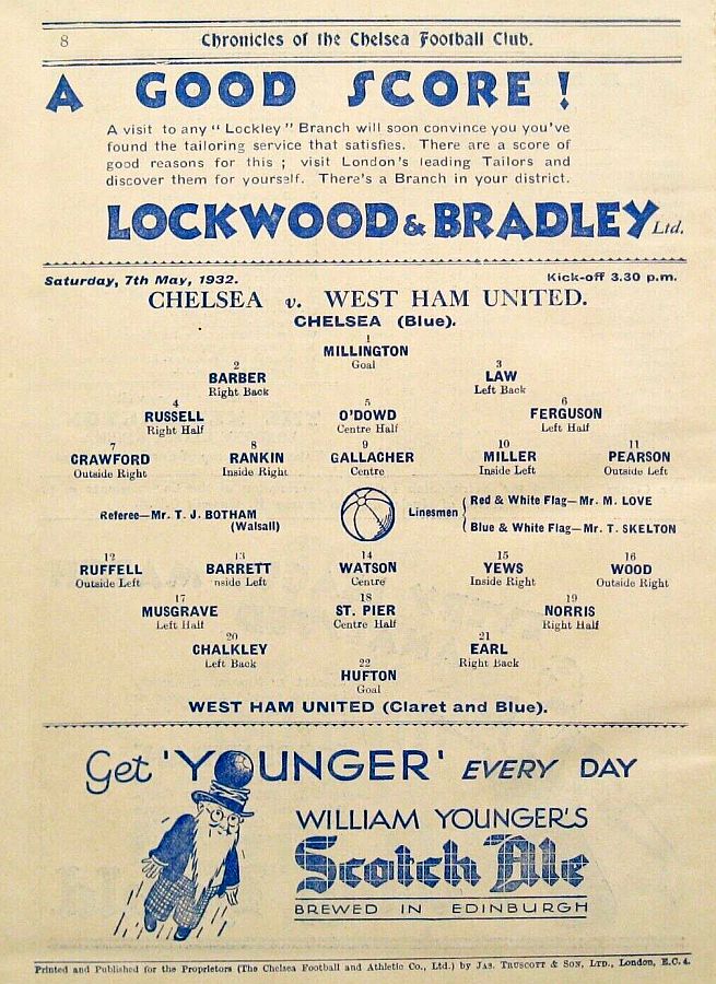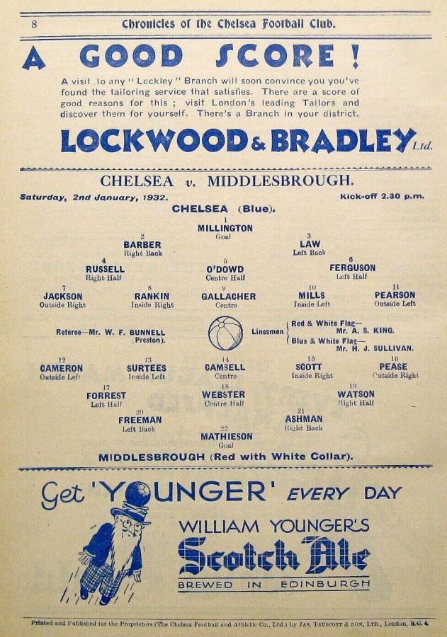 1 Vic Woodley, 2 George Barber, 3 Tommy Law, 4 William Russell, 5 Peter O'Dowd, 6 Willie Ferguson, 7 John Rankin, 8 Harold Miller, 9 Hughie Gallacher, 10 Wilf Chitty, 11 George Pearson |