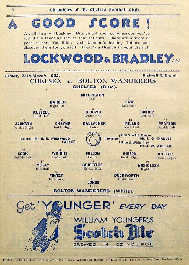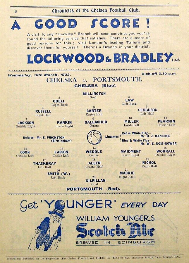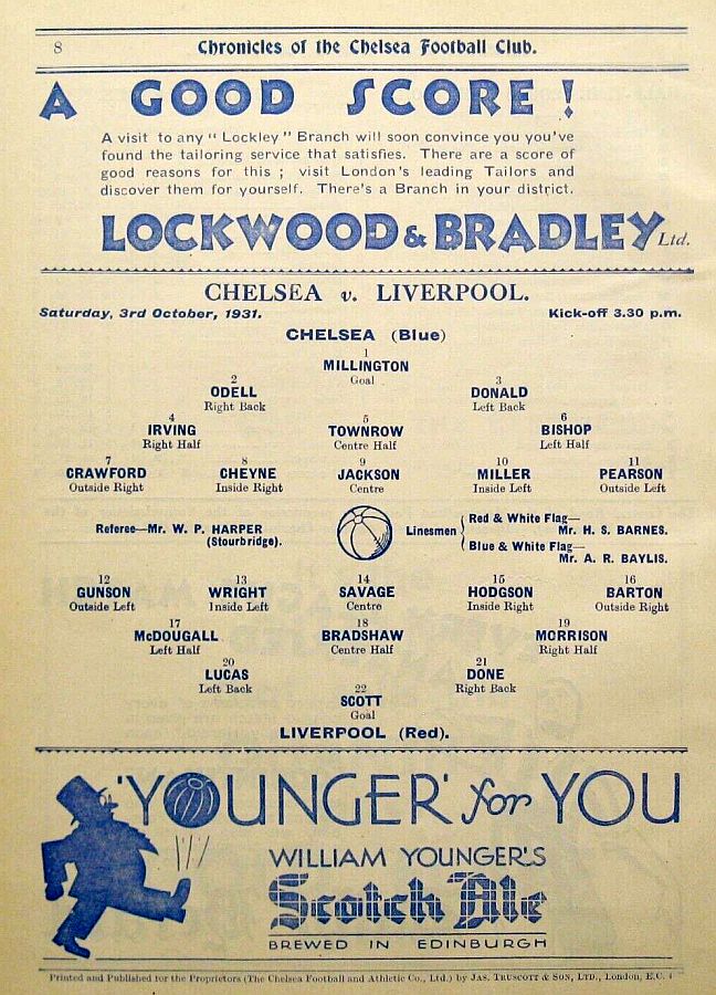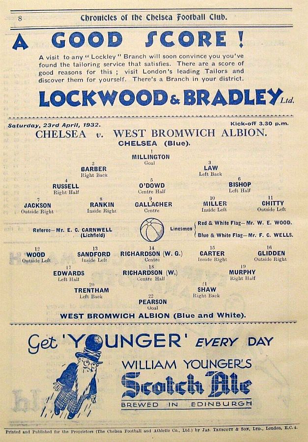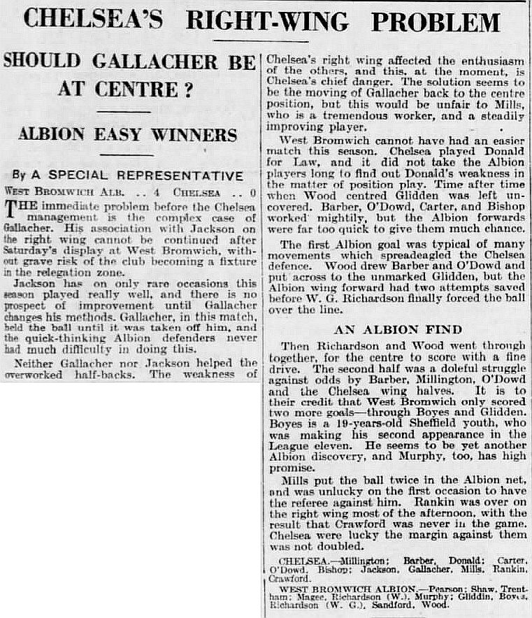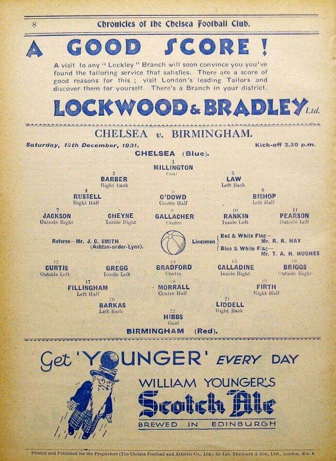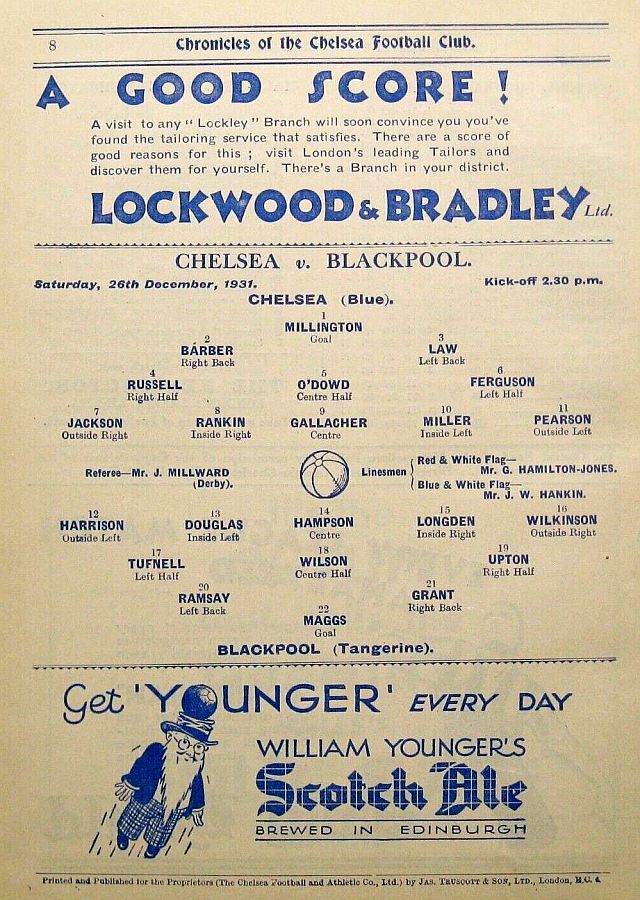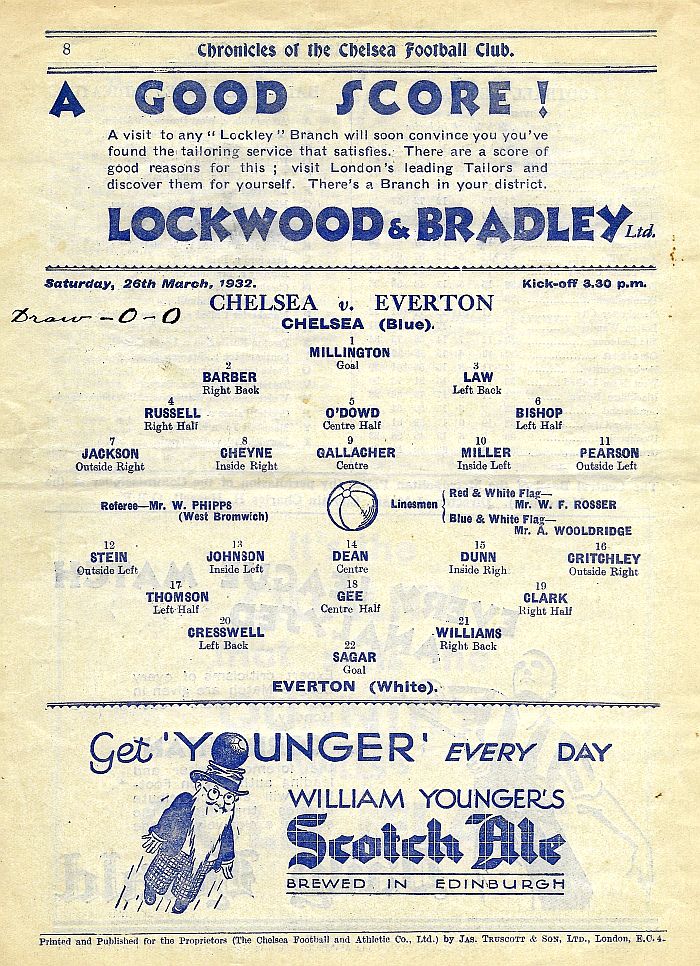 1 Vic Woodley, 2 George Barber, 3 Tommy Law, 4 William Russell, 5 Peter O'Dowd, 6 Willie Ferguson, 7 John Rankin, 8 Harold Miller, 9 Hughie Gallacher, 10 Wilf Chitty, 11 George Pearson |