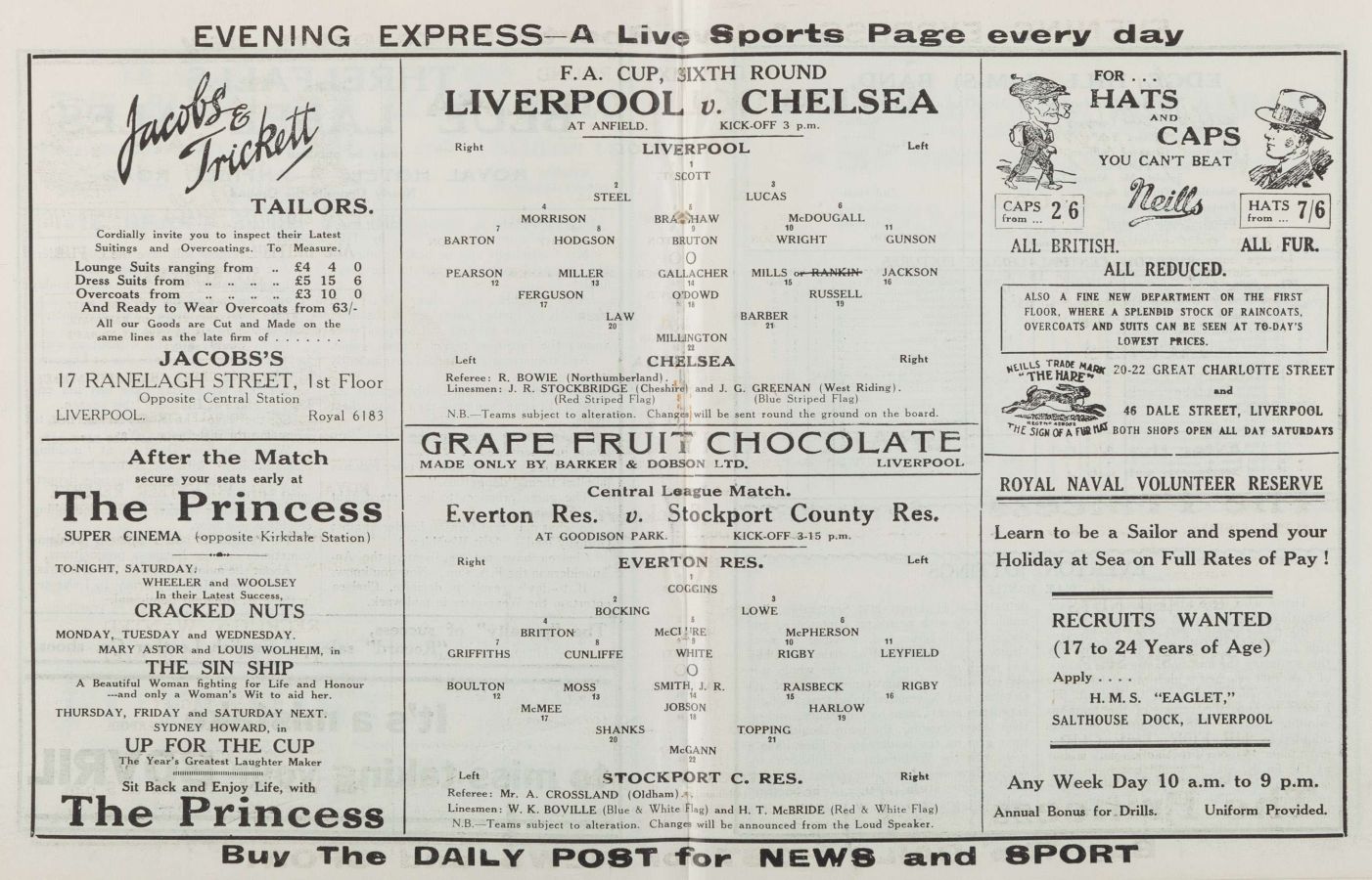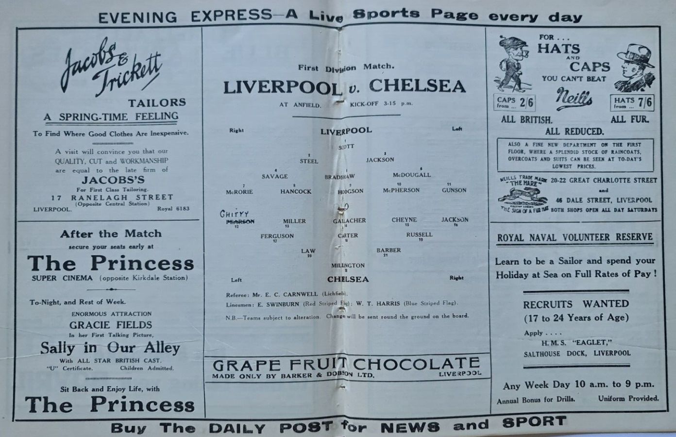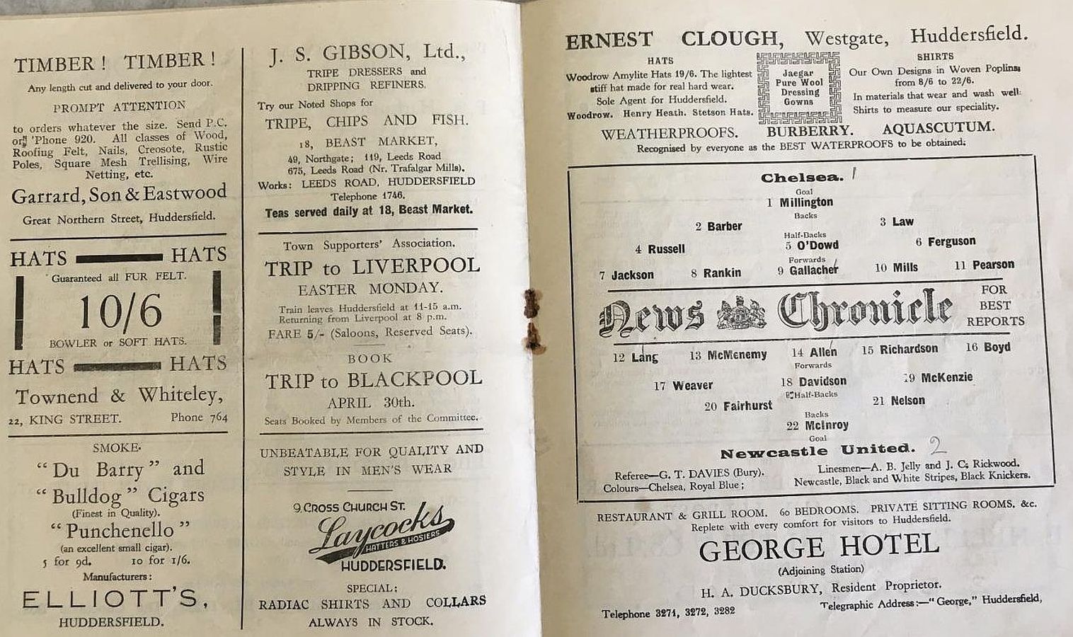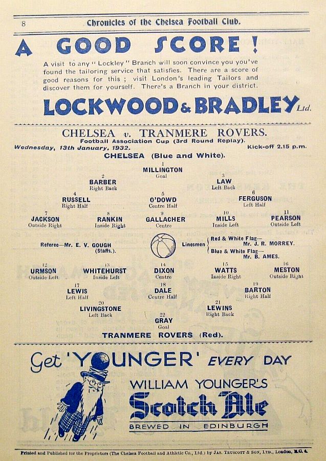 1 Vic Woodley, 2 George Barber, 3 Tommy Law, 4 William Russell, 5 Peter O'Dowd, 6 Willie Ferguson, 7 John Rankin, 8 Harold Miller, 9 Hughie Gallacher, 10 Wilf Chitty, 11 George Pearson |