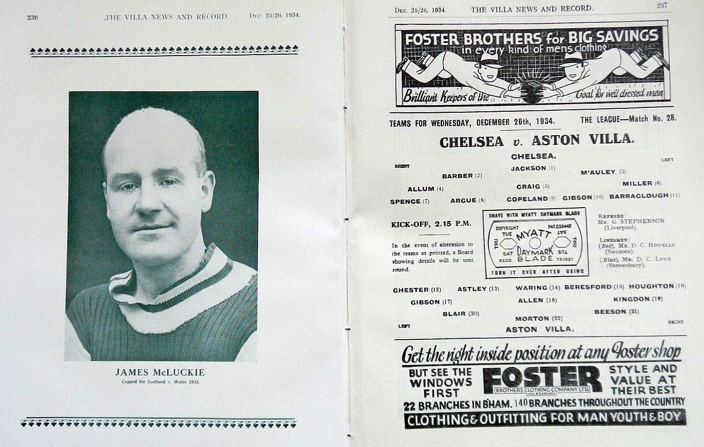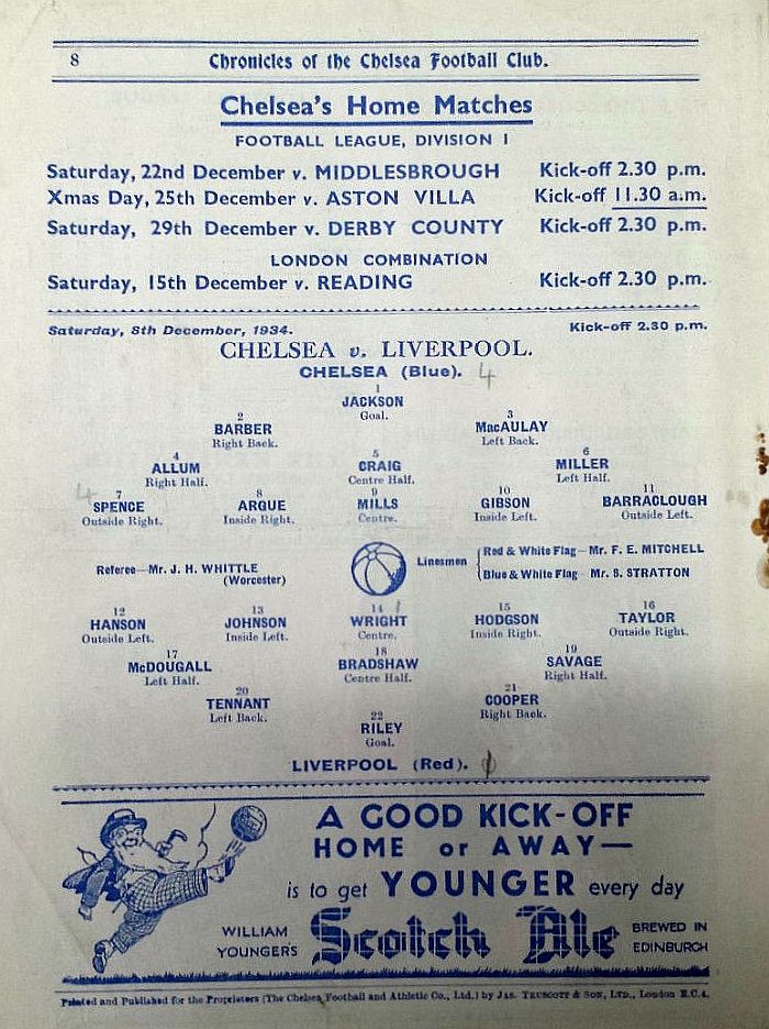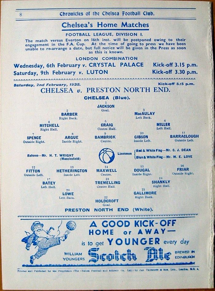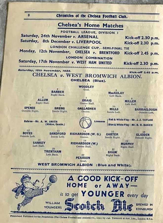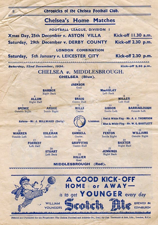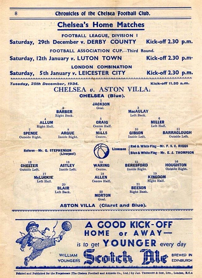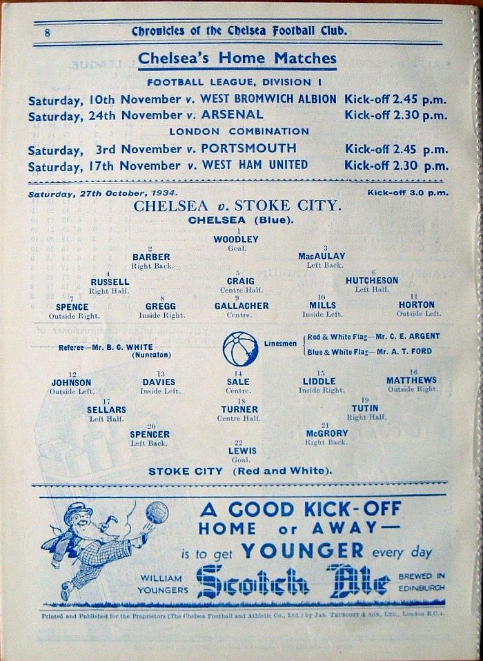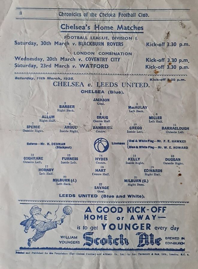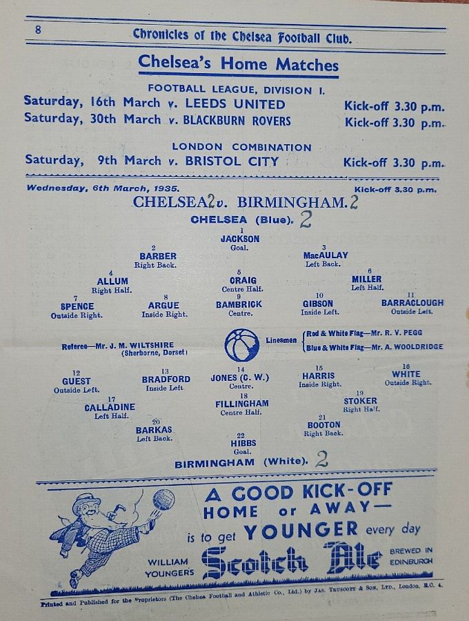 1 Vic Woodley, 2 George Barber, 3 Bob MacAulay, 4 William Russell, 5 Allan Craig, 6 Harold Miller, 7 Eric Oakton, 8 Hughie Gallacher, 9 George Mills, 10 George Gibson, 11 Jack Horton |