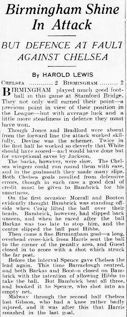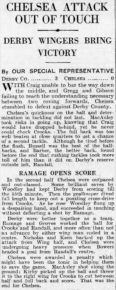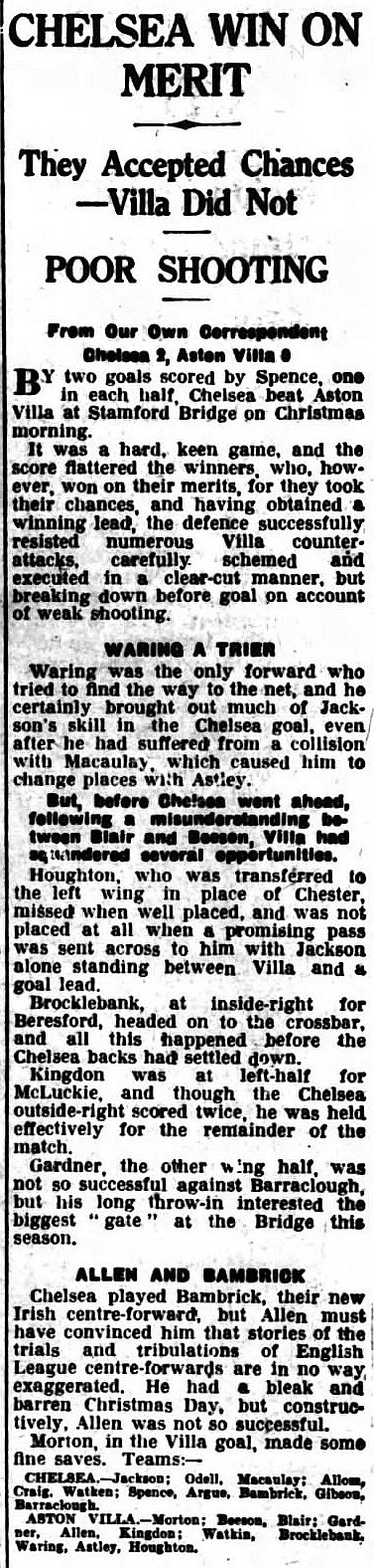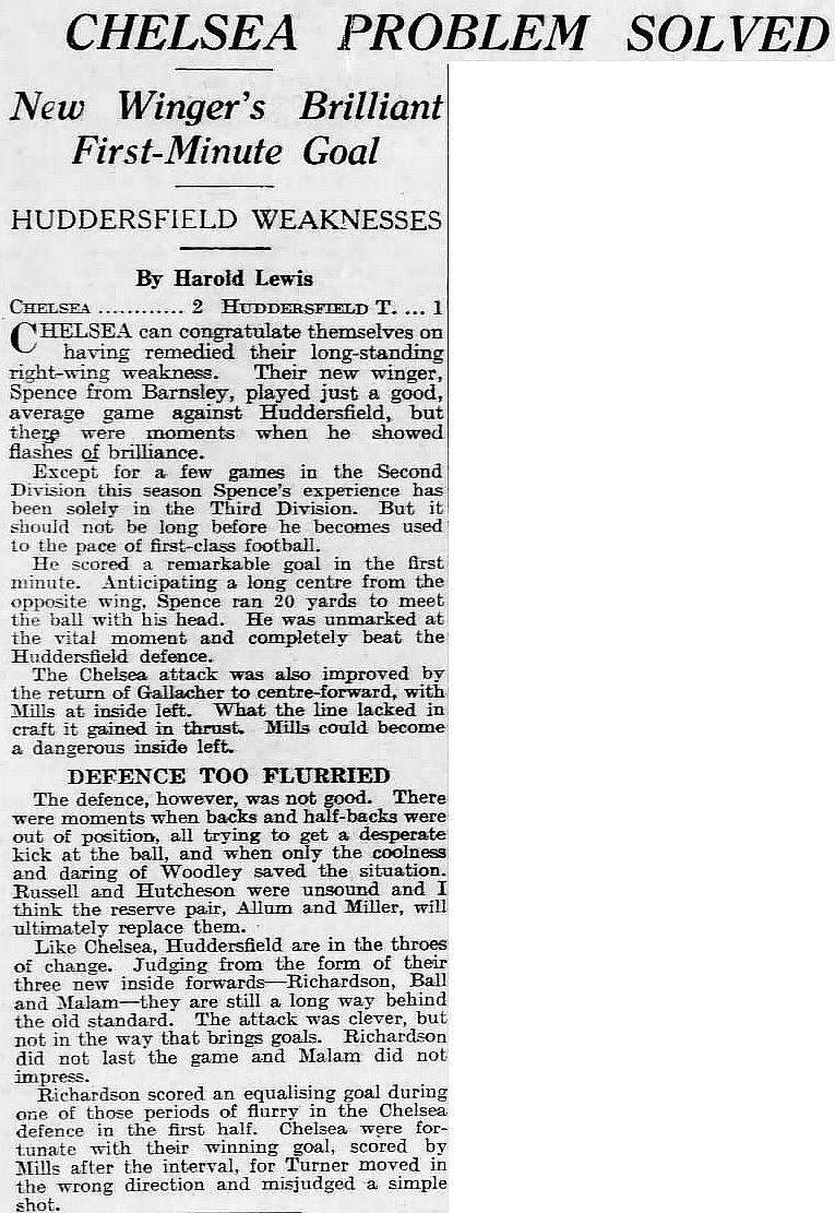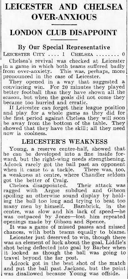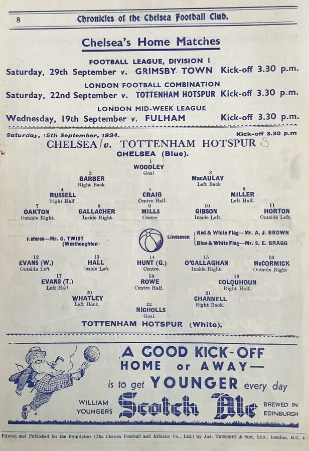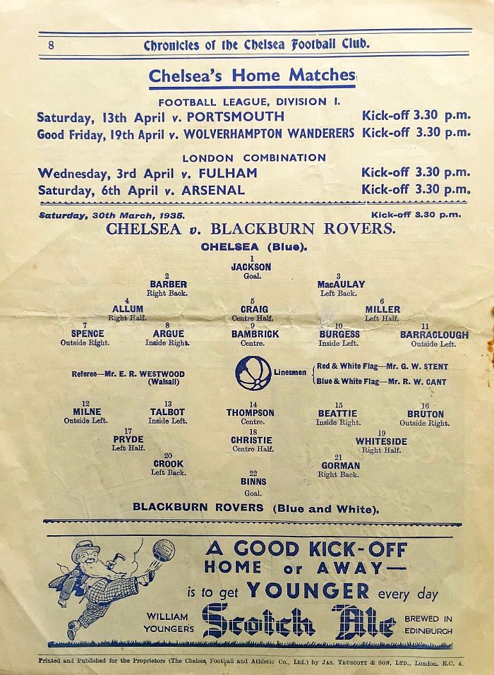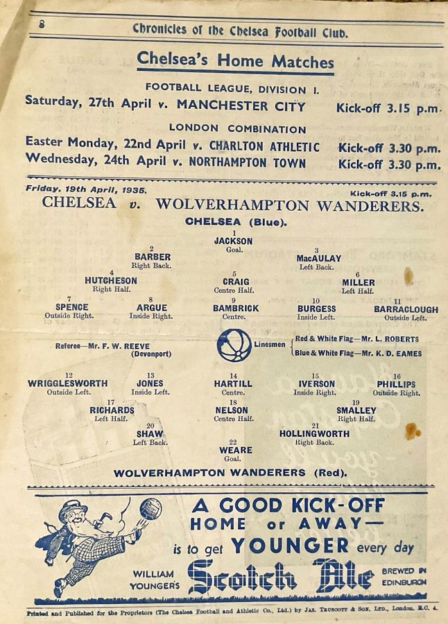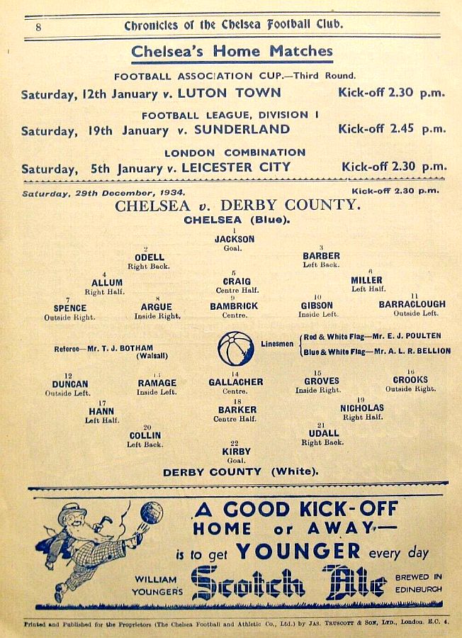 1 Vic Woodley, 2 George Barber, 3 Bob MacAulay, 4 William Russell, 5 Allan Craig, 6 Harold Miller, 7 Eric Oakton, 8 Hughie Gallacher, 9 George Mills, 10 George Gibson, 11 Jack Horton |