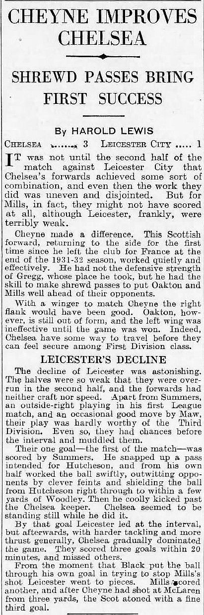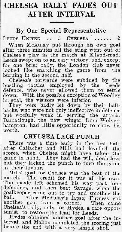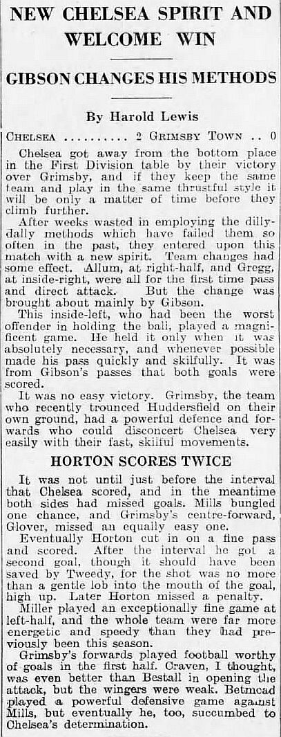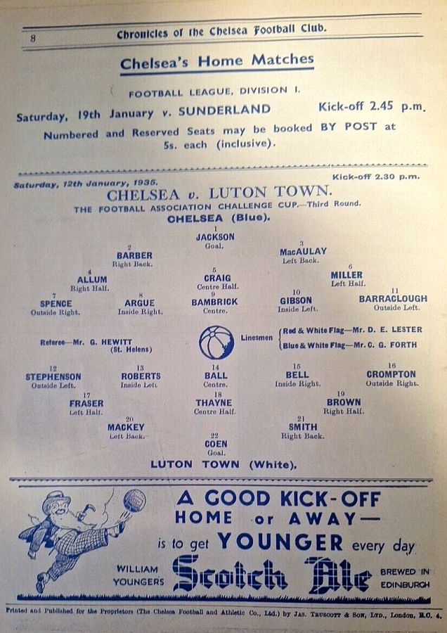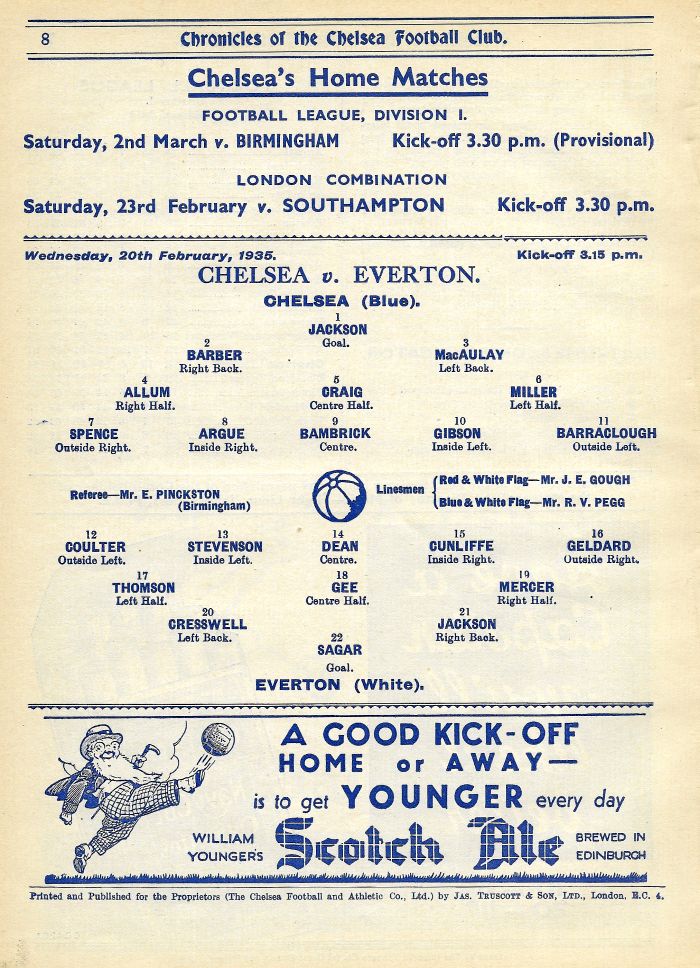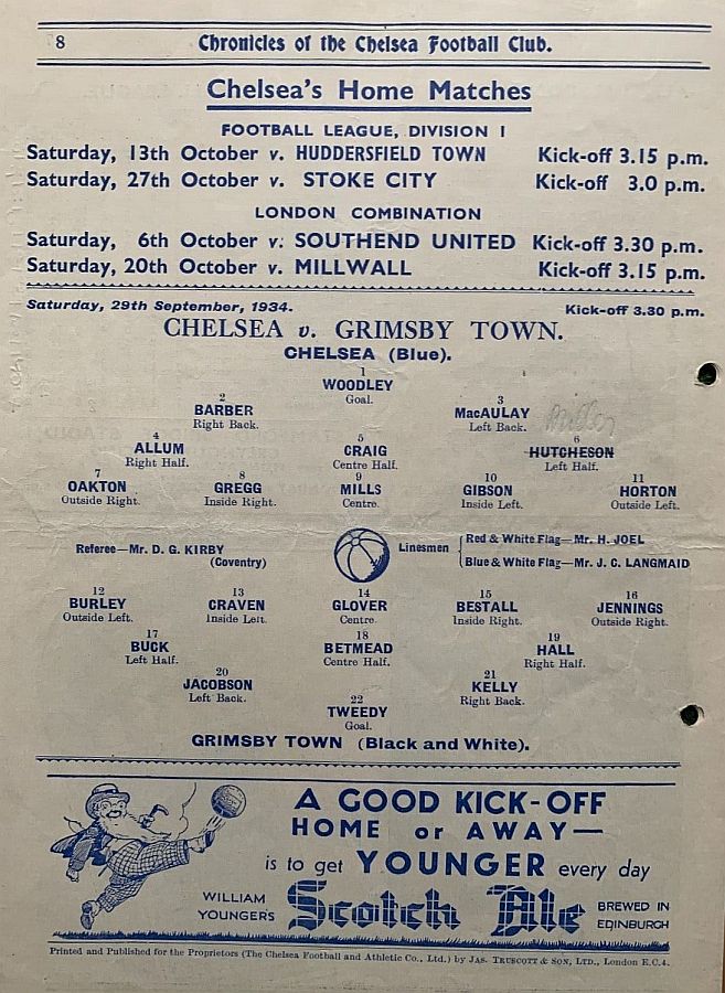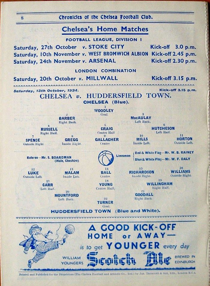 1 Vic Woodley, 2 Leslie Odell, 3 Bob MacAulay, 4 William Russell, 5 Allan Craig, 6 Harold Miller, 7 Eric Oakton, 8 Hughie Gallacher, 9 George Mills, 10 George Gibson, 11 Jack Horton |