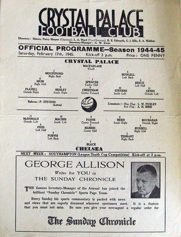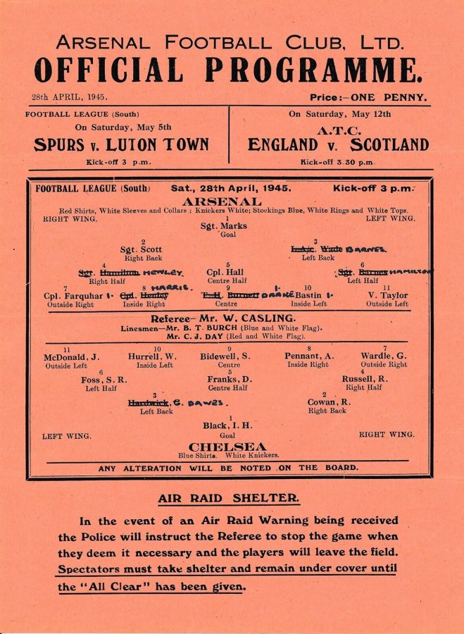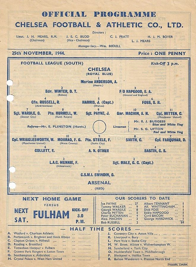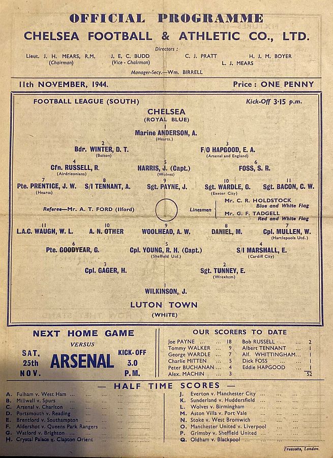 Vic Woodley, Bart Purvis, Eddie Hapgood, Albert Tennant, John Harris, Dickie Foss, Peter Buchanan, Tommy Walker, Joe Payne, George Mills, Charlie Mitten |