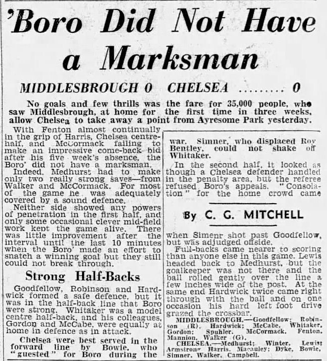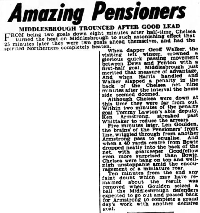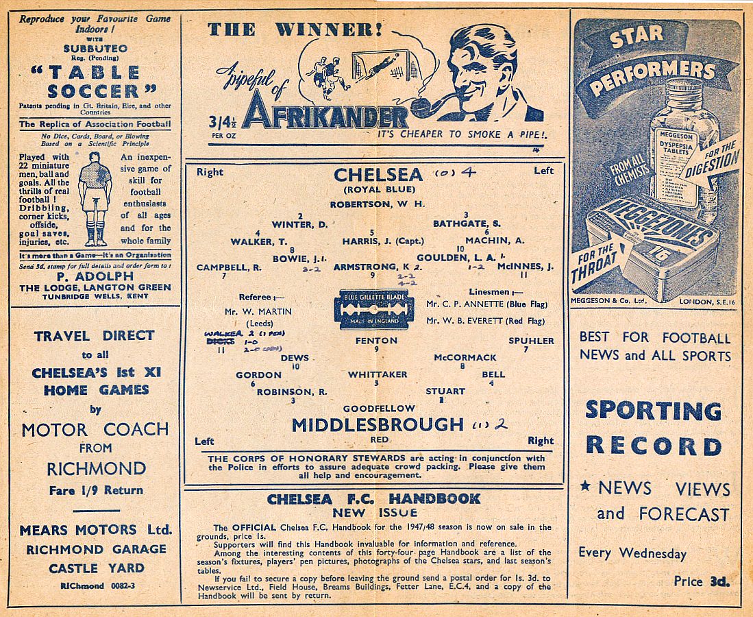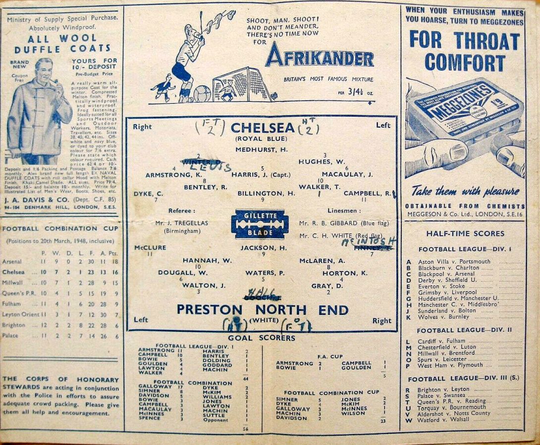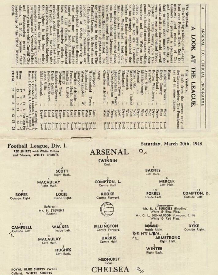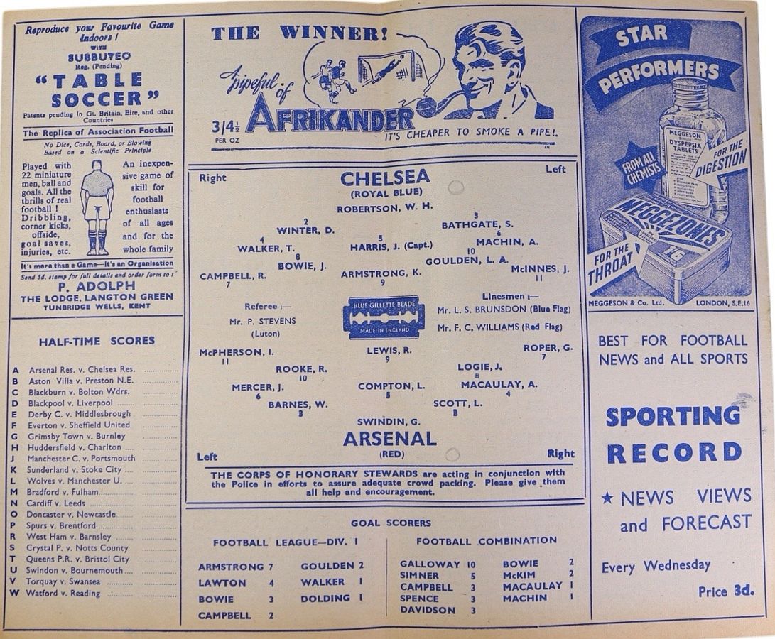 1 Harry Medhurst, 2 Daniel Winter, 3 Freddie Lewis, 4 Ken Armstrong, 5 John Harris, 6 Jimmy Macaulay, 7 Charles Dyke, 8 James Bowie, 9 Roy Bentley, 10 Tommy Walker, 11 Bobby Campbell |