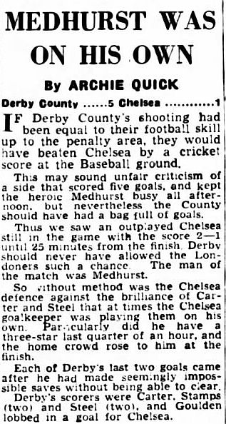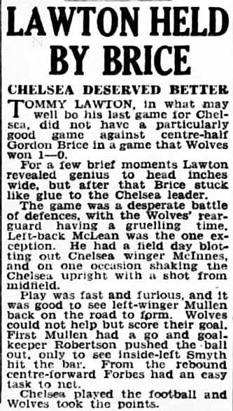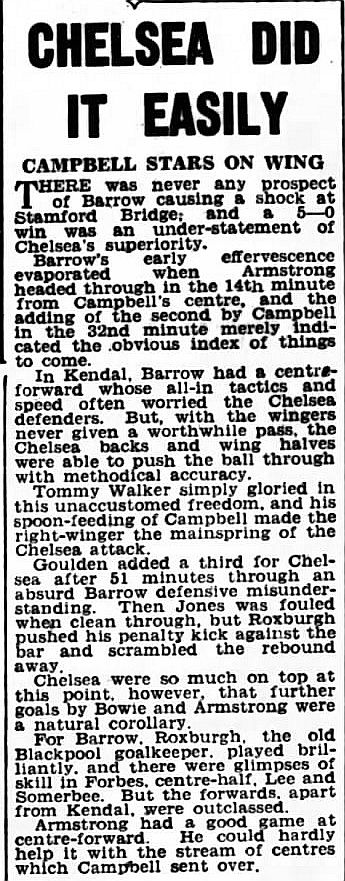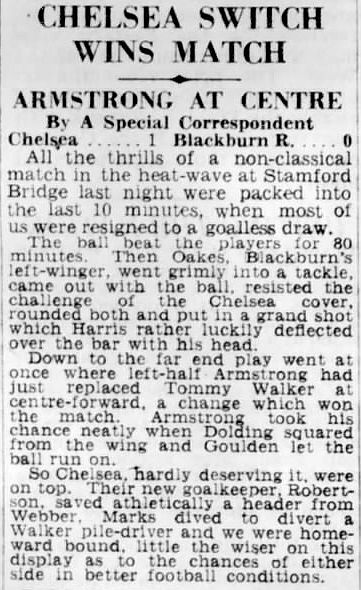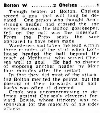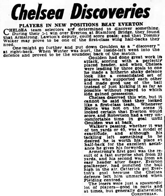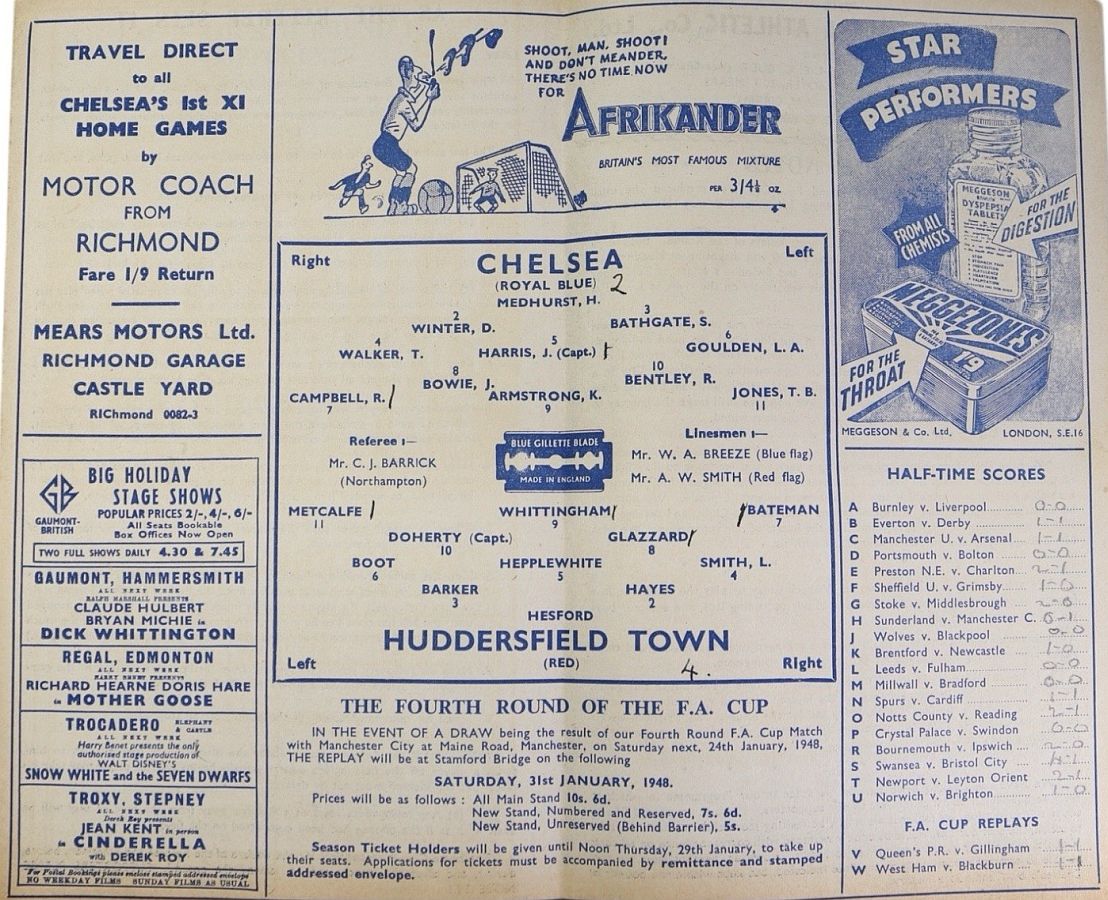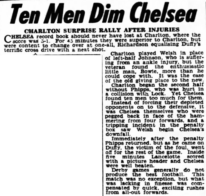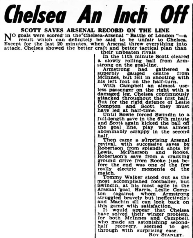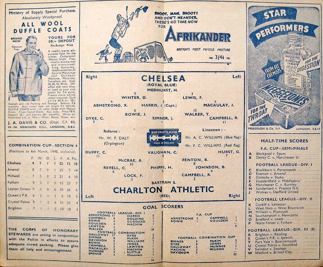 1 Harry Medhurst, 2 Daniel Winter, 3 Freddie Lewis, 4 Ken Armstrong, 5 John Harris, 6 Jimmy Macaulay, 7 Charles Dyke, 8 James Bowie, 9 Roy Bentley, 10 Tommy Walker, 11 Bobby Campbell |