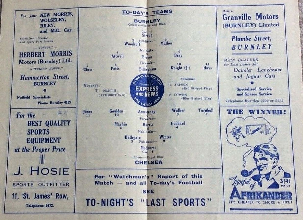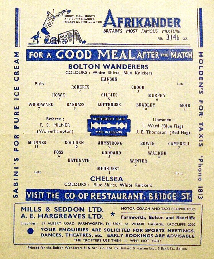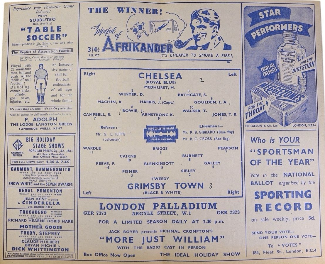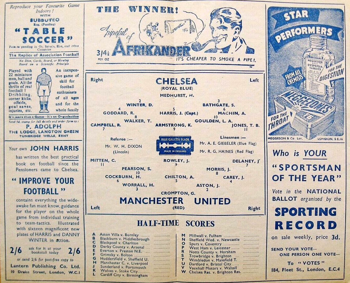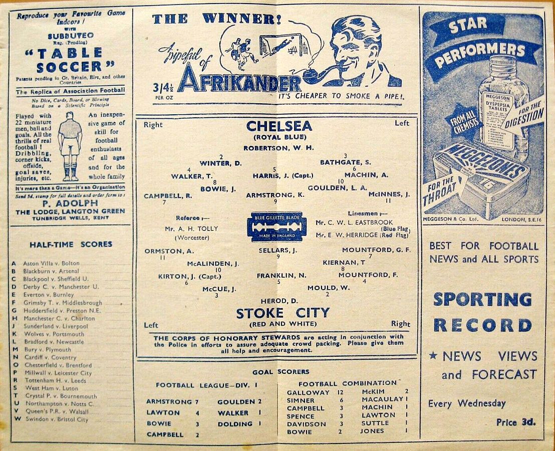 1 Harry Medhurst, 2 Freddie Lewis, 3 Sid Bathgate, 4 Ken Armstrong, 5 John Harris, 6 Philip McKnight, 7 Charles Dyke, 8 Roy Bentley, 9 Hugh Billington, 10 Tommy Walker, 11 Benny Jones |