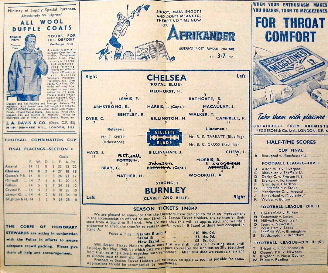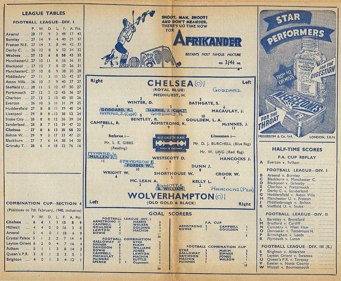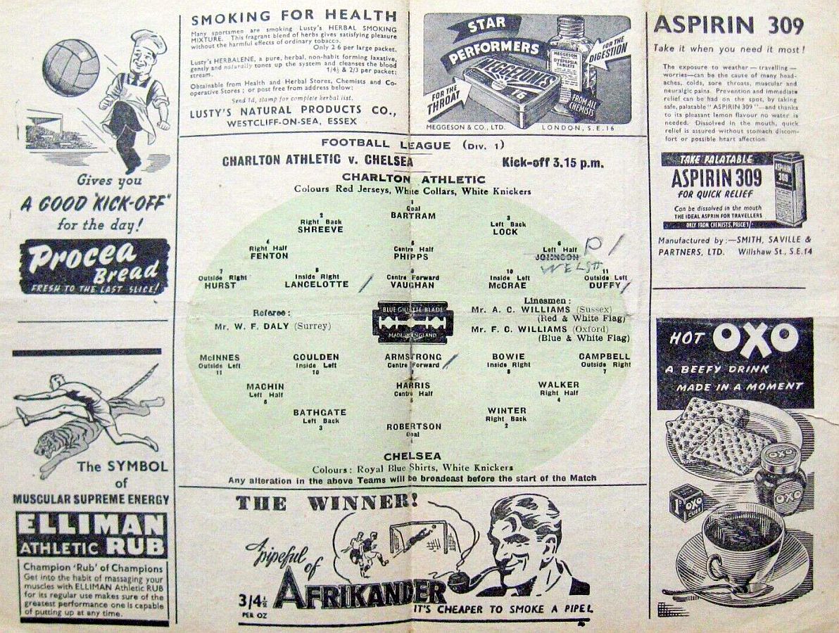 1 Harry Medhurst, 2 Freddie Lewis, 3 Sid Bathgate, 4 Ken Armstrong, 5 John Harris, 6 Jimmy Macaulay, 7 Charles Dyke, 8 Roy Bentley, 9 Hugh Billington, 10 Tommy Walker, 11 Bobby Campbell |