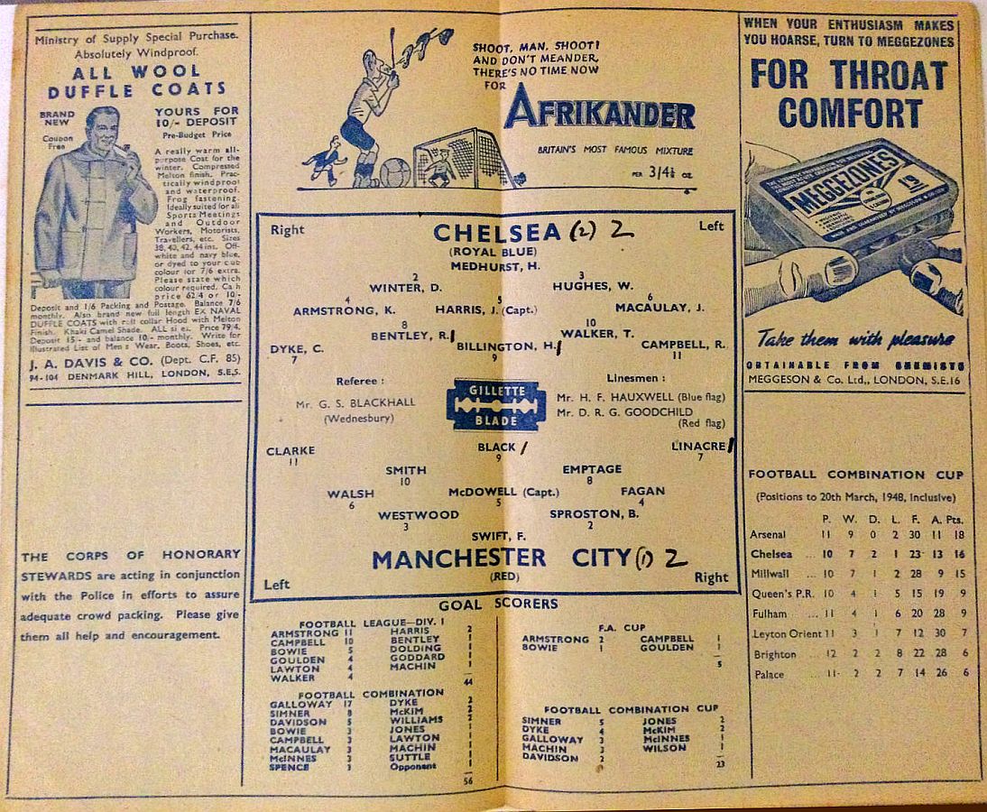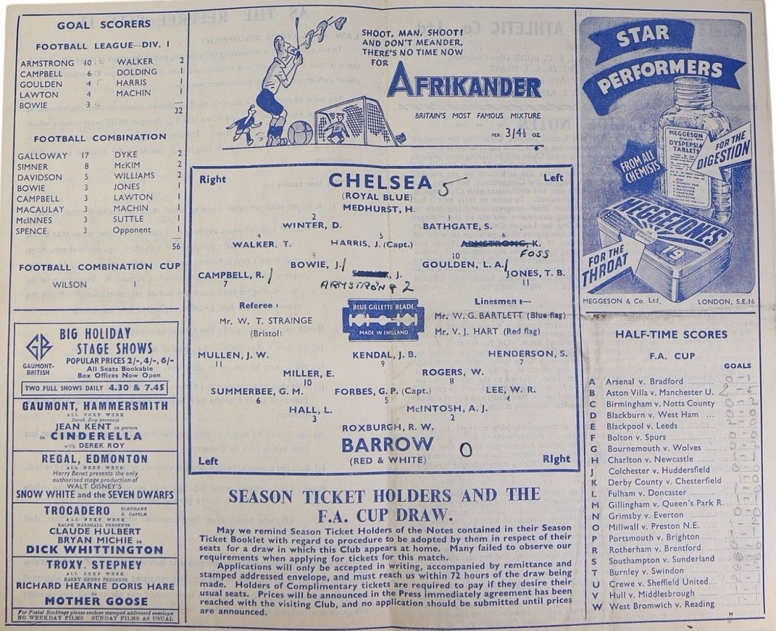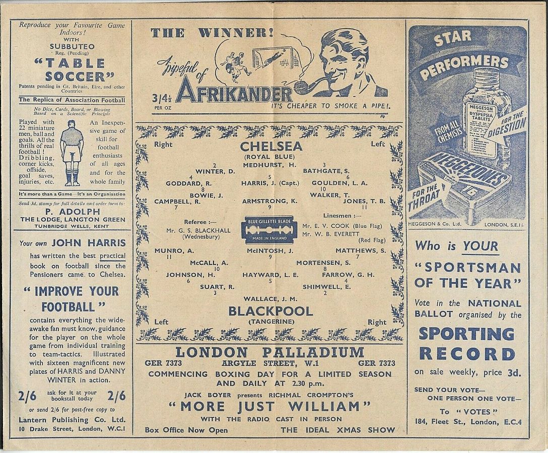 1 Harry Medhurst, 2 Freddie Lewis, 3 Sid Bathgate, 4 Ken Armstrong, 5 John Harris, 6 Jimmy Macaulay, 7 Benny Jones, 8 Roy Bentley, 9 Hugh Billington, 10 Tommy Walker, 11 Bobby Campbell |
