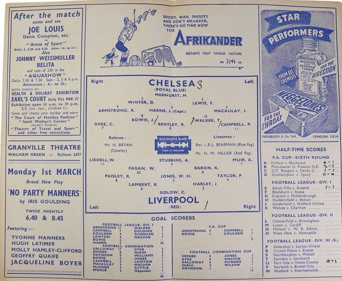 Cyril Sidlow, Jim Harley, Ray Lambert, Phil Taylor, Bill Jones, Bob Paisley, Alex Muir, Kevin Baron, Albert Stubbins, Willie Fagan, Billy Liddell |