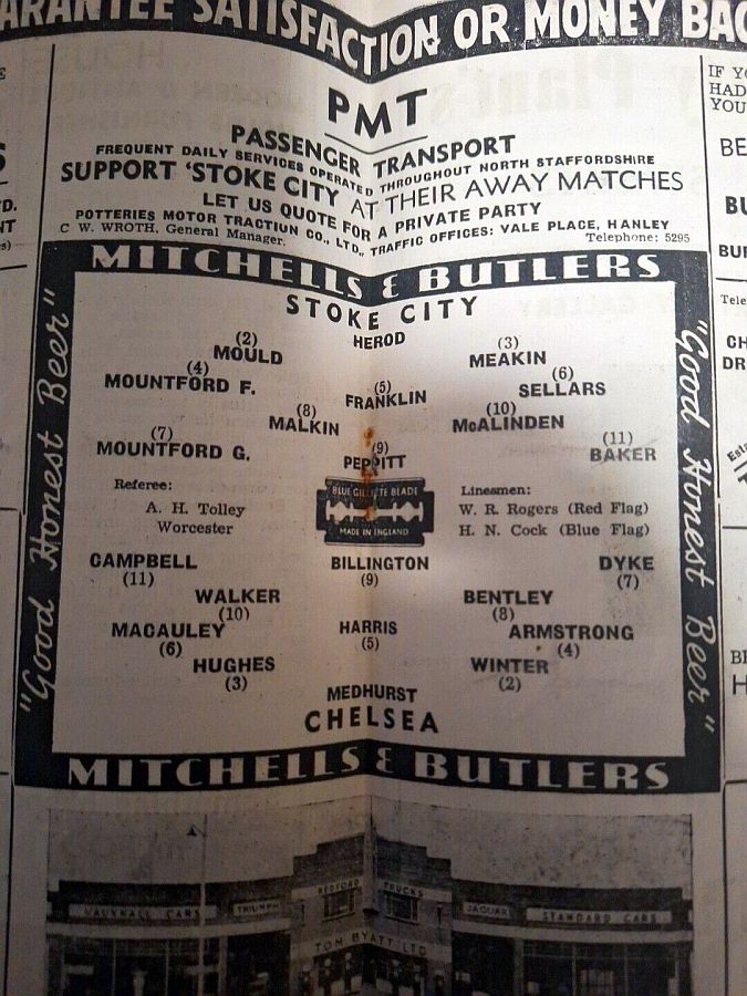 Dennis Herod, Billy Mould, Harry Meakin, Frank Mountford, Neil Franklin, Johnny Sellars, George Mountford, Jack Malkin, Syd Peppitt, Jimmy McAlinden, Alec Ormston |