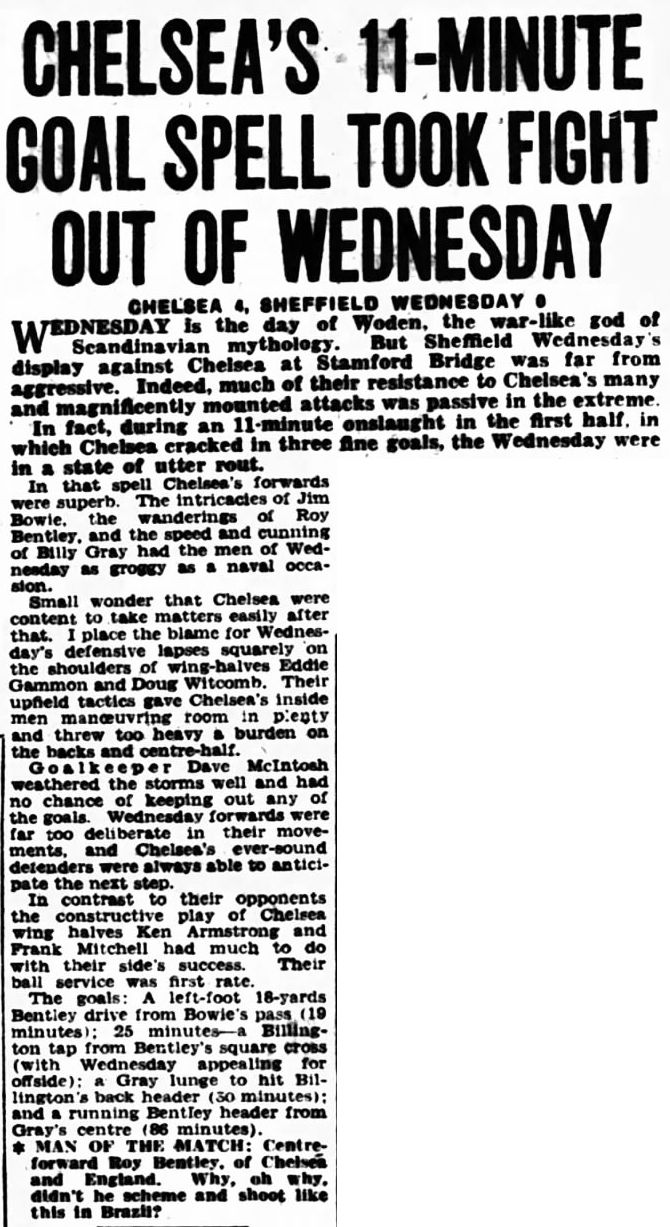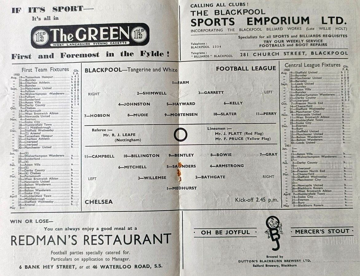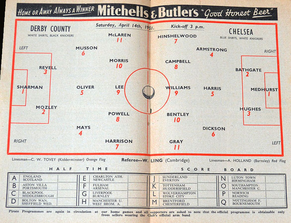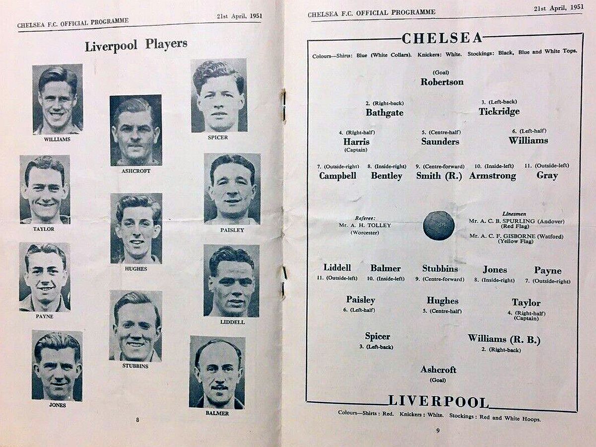 1 Harry Medhurst, 2 Sid Bathgate, 3 Billy Hughes, 4 Ken Armstrong, 5 John Harris, 6 Bill Dickson, 7 Wally Hinshelwood, 8 Bobby Campbell, 9 Reg Williams, 10 Roy Bentley, 11 Billy Gray |