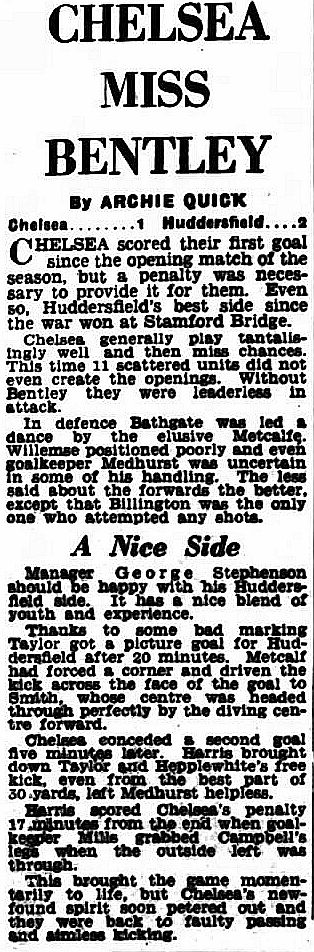 1 Harry Medhurst, 2 Sid Bathgate, 3 Stan Willemse, 4 Ken Armstrong, 5 John Harris, 6 Frank Mitchell, 7 Billy Gray, 8 James Bowie, 9 Roy Bentley, 10 Hugh Billington, 11 Reg Williams |