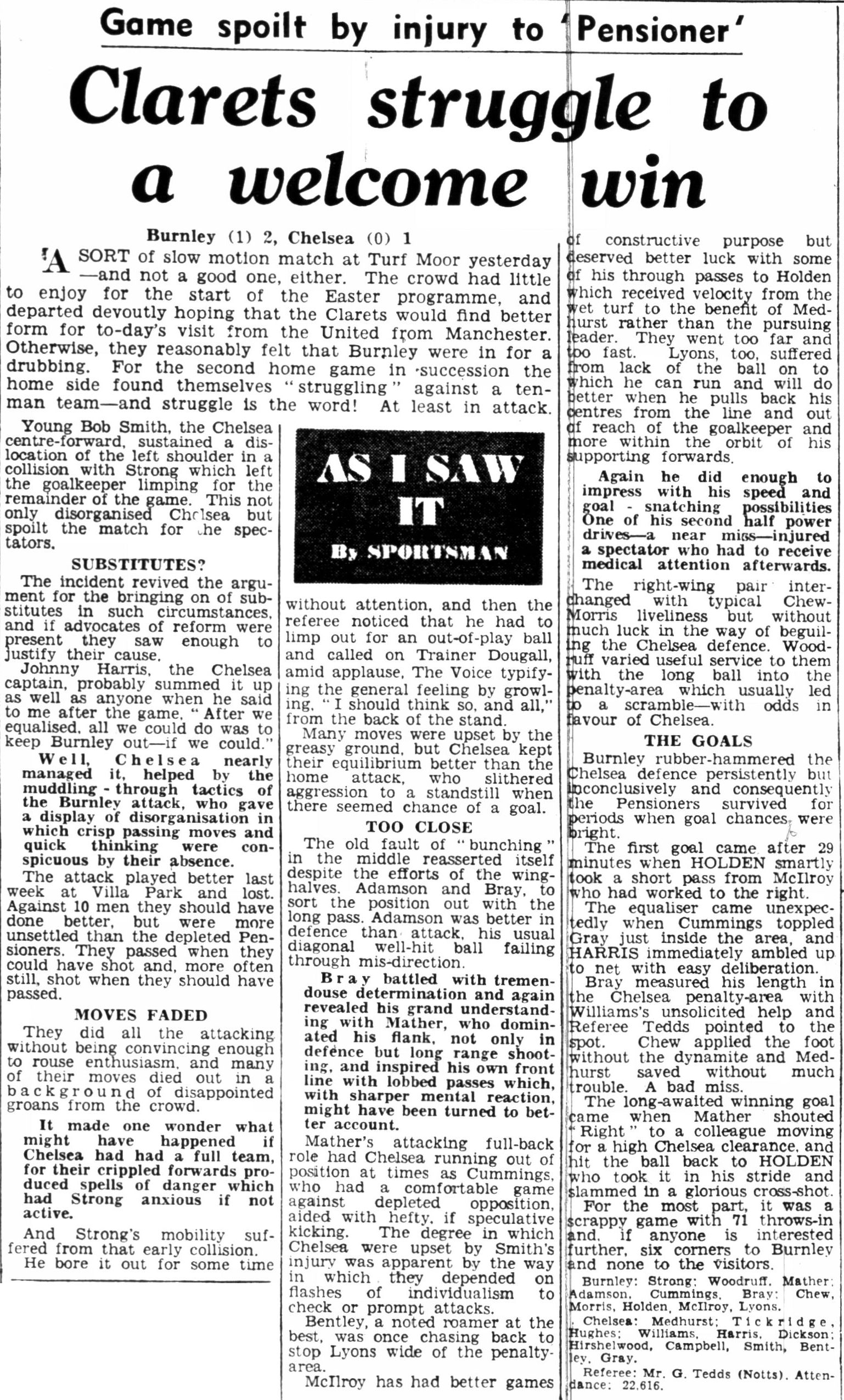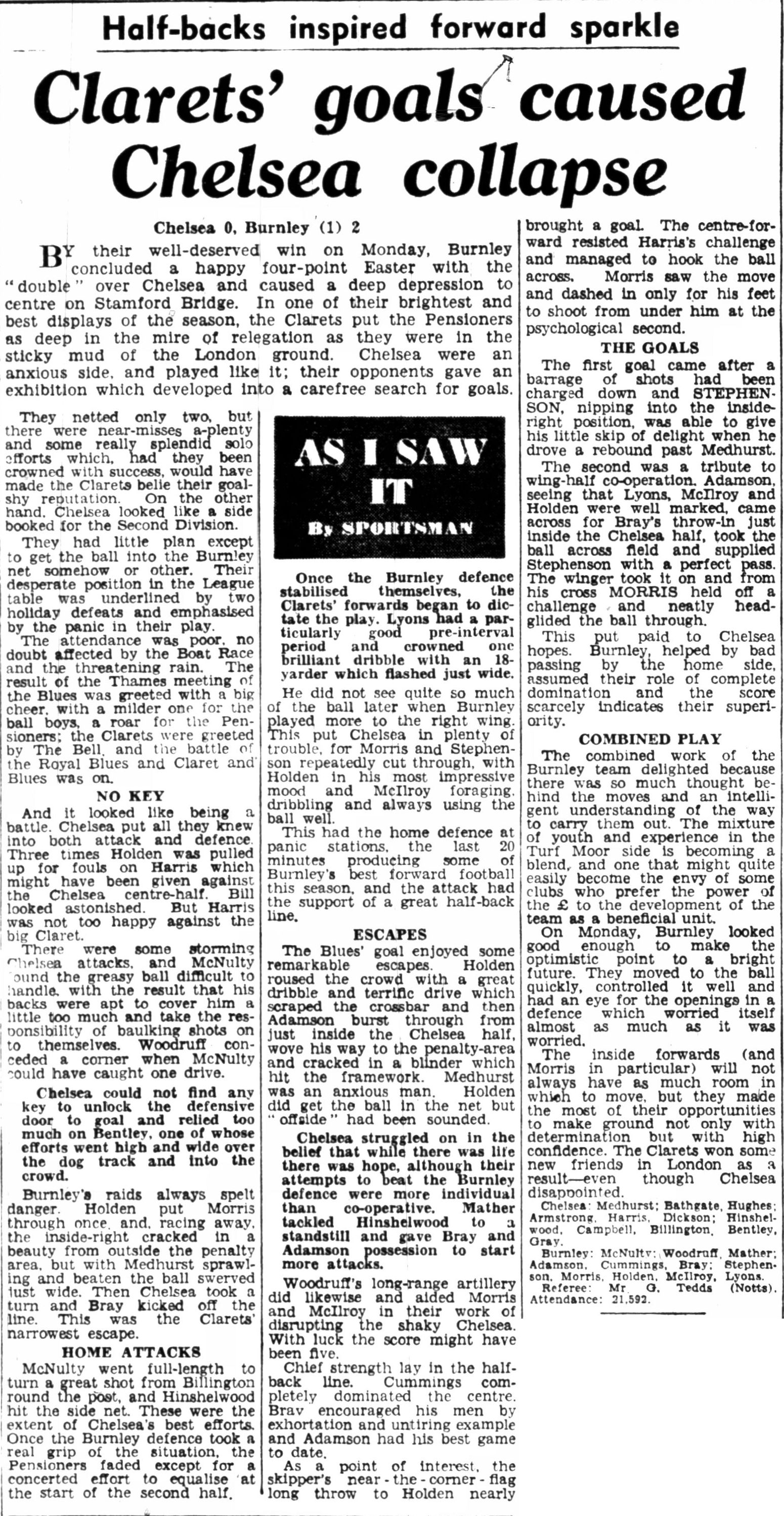 Joe McNulty, Arthur Woodruff, Harry Mather, Jimmy Adamson, Tommy Cummings, George Bray, Roy Stephenson, Billy Morris, Bill Holden, Jimmy McIlroy, Terry Lyons |