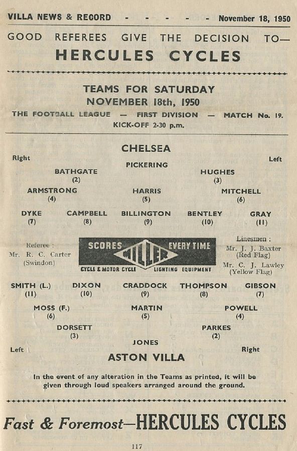 1 Bill Robertson, 2 Sid Bathgate, 3 Sid Tickridge, 4 Bill Dickson, 5 Jack Saunders, 6 Frank Mitchell, 7 Bobby Campbell, 8 Roy Bentley, 9 Bobby Smith, 10 Ken Armstrong, 11 Reg Williams |