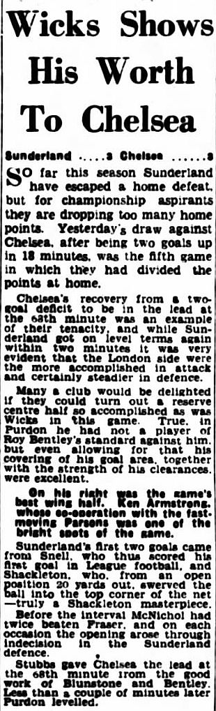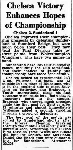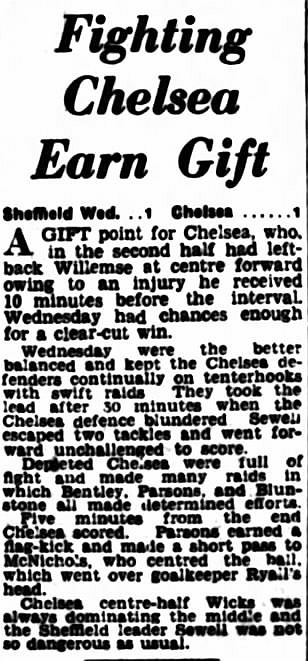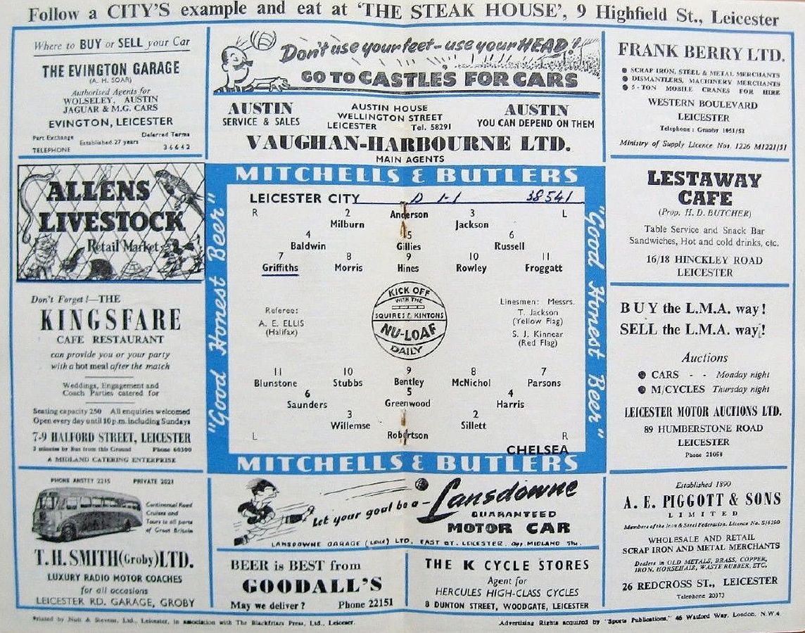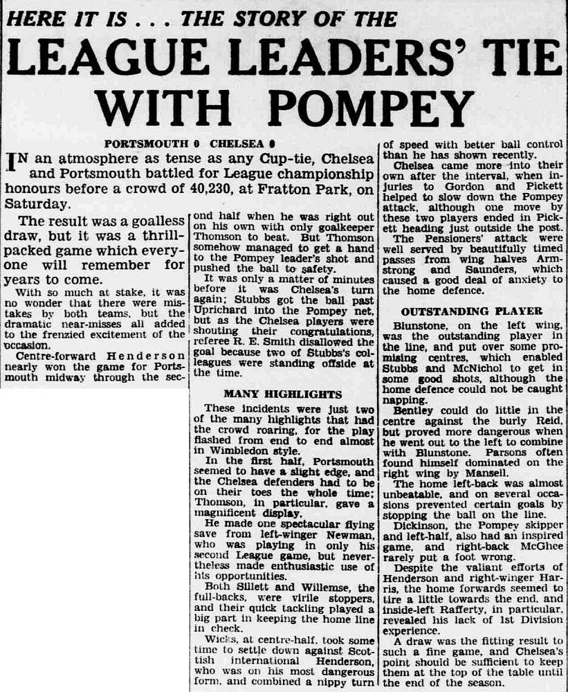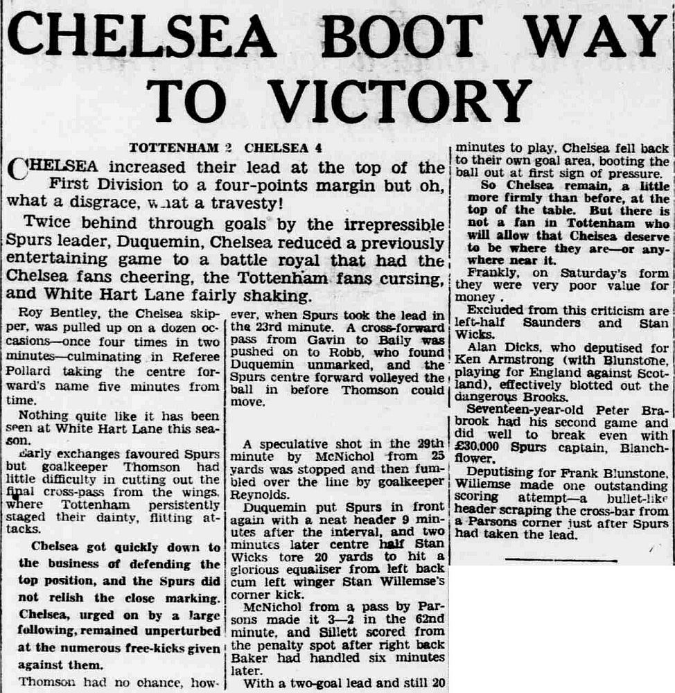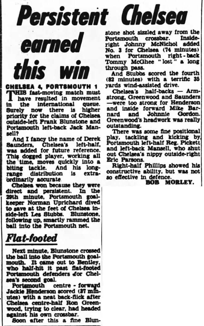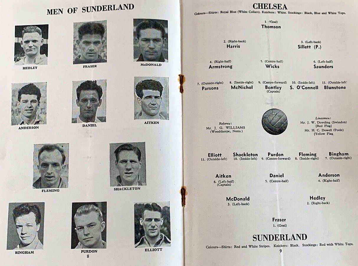 1 Chick Thomson, 2 John Harris, 3 Peter Sillett, 4 Ken Armstrong, 5 Stan Wicks, 6 Derek Saunders, 7 Eric Parsons, 8 Johnny McNichol, 9 Roy Bentley, 10 Peter Brabrook, 11 Frank Blunstone |