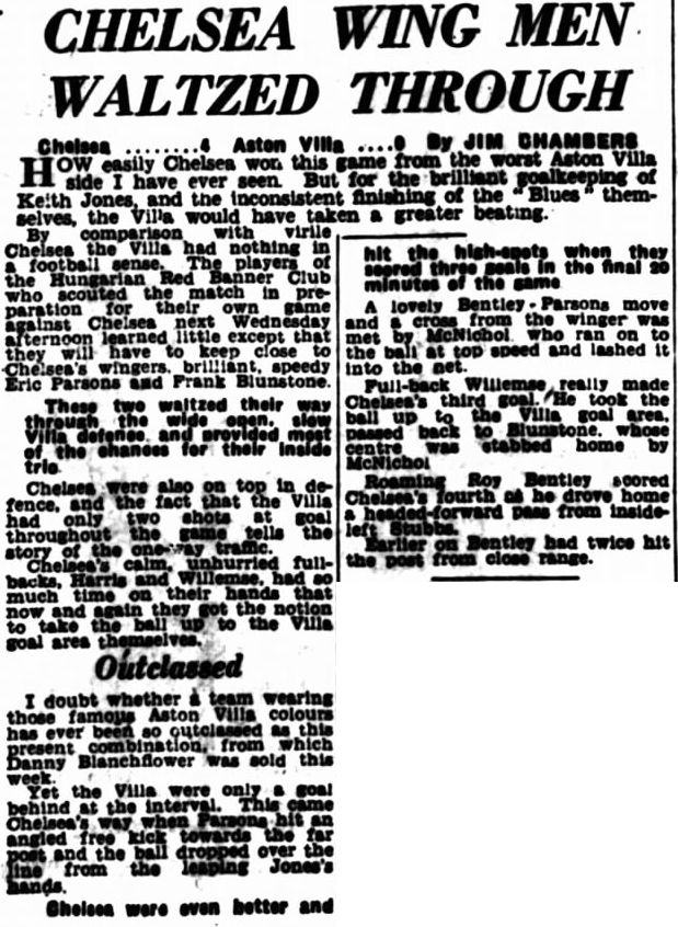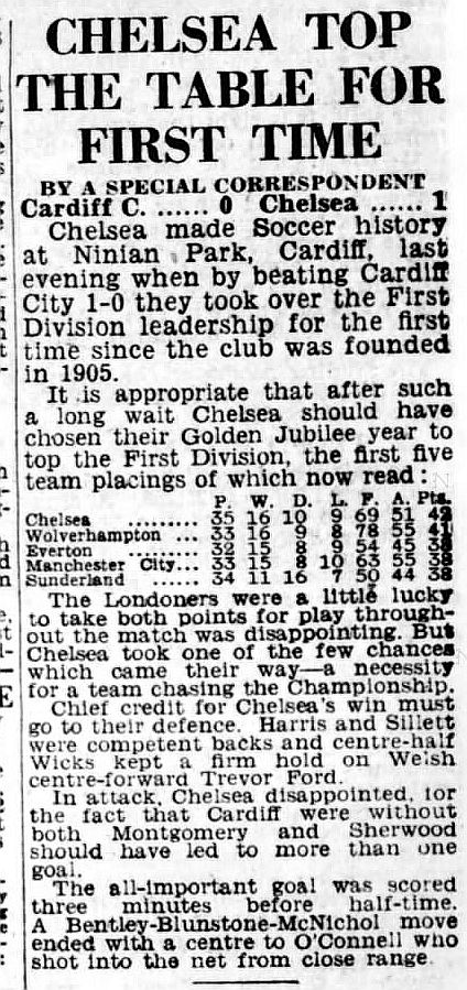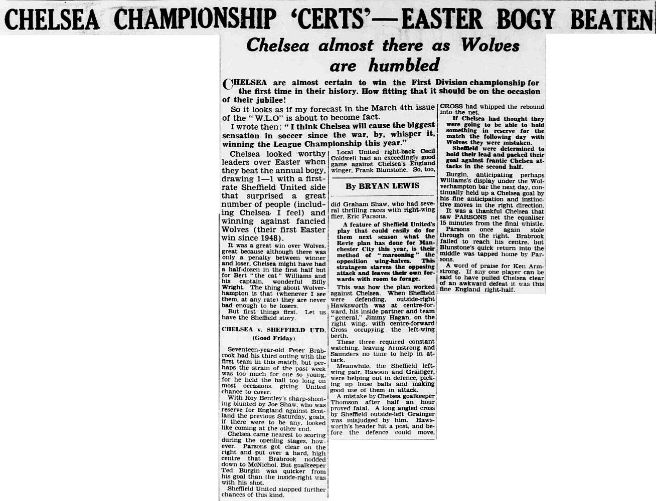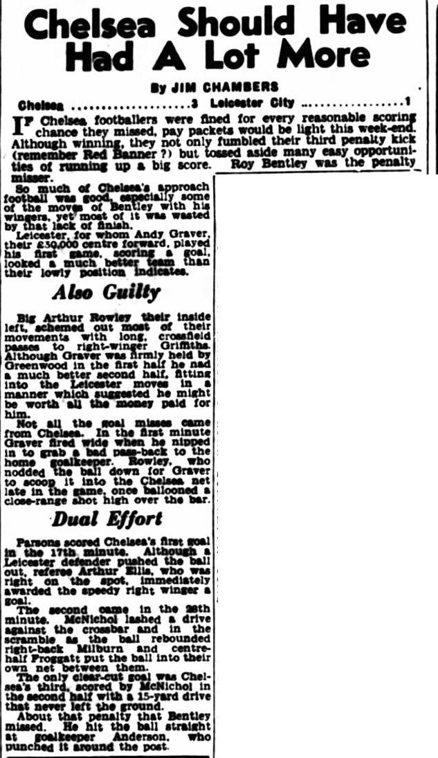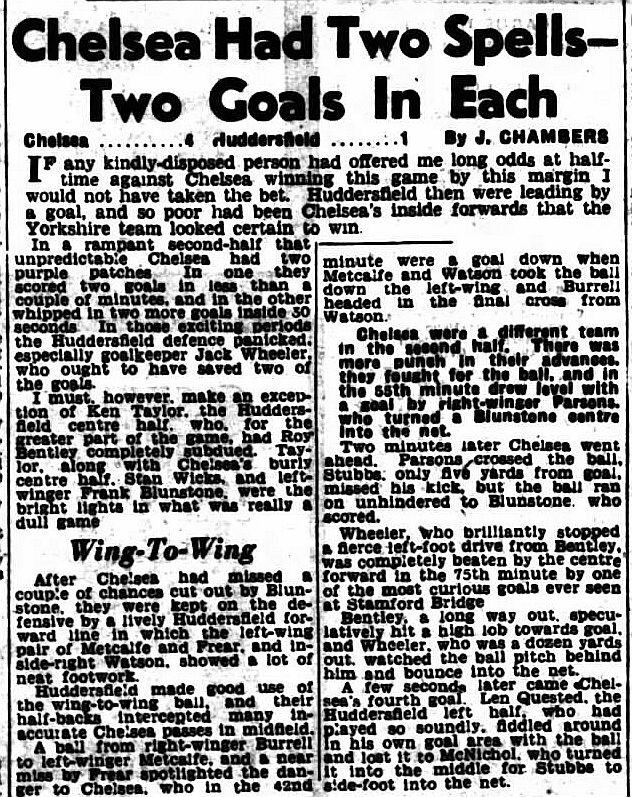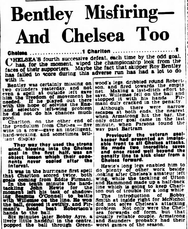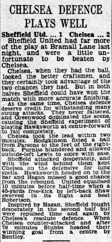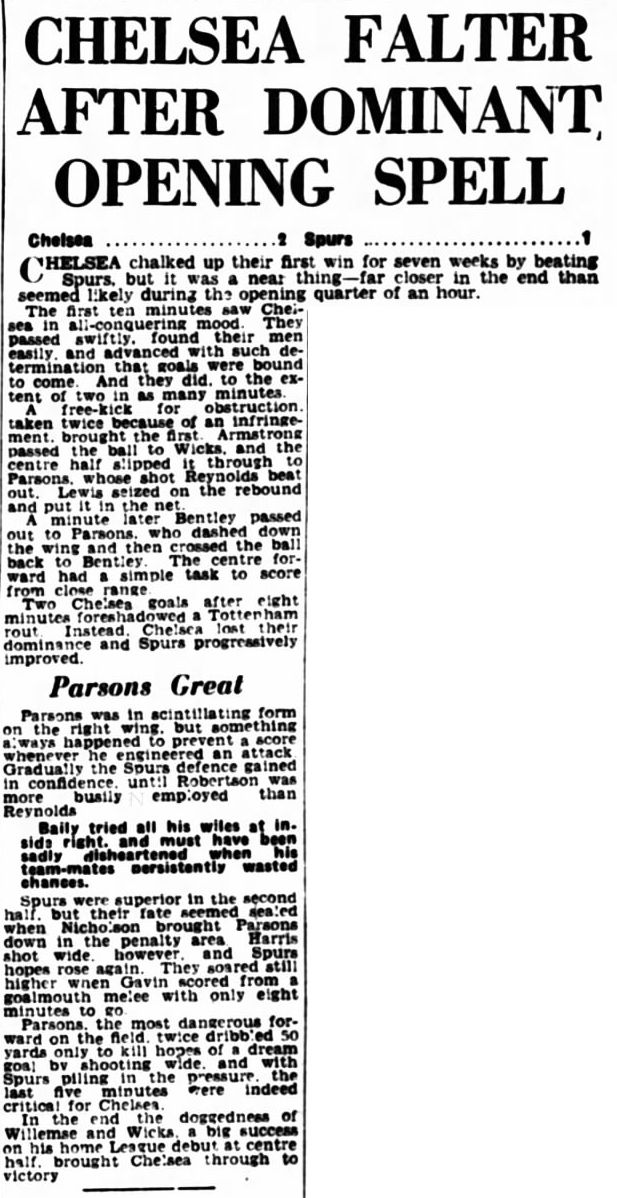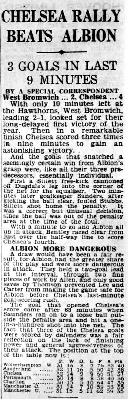 1 Chick Thomson, 2 John Harris, 3 Peter Sillett, 4 Ken Armstrong, 5 Stan Wicks, 6 Derek Saunders, 7 Eric Parsons, 8 Johnny McNichol, 9 Roy Bentley, 10 Peter Brabrook, 11 Frank Blunstone |