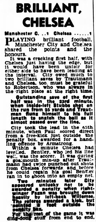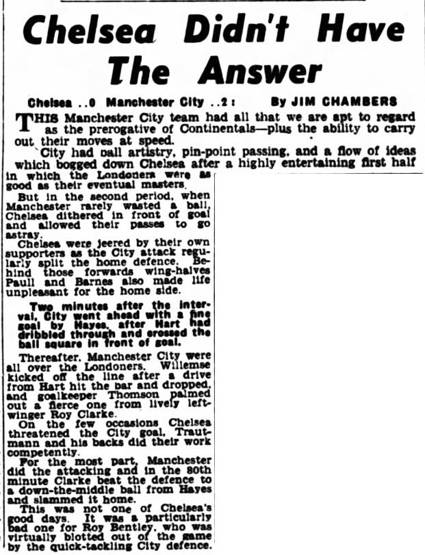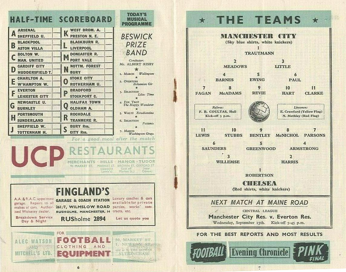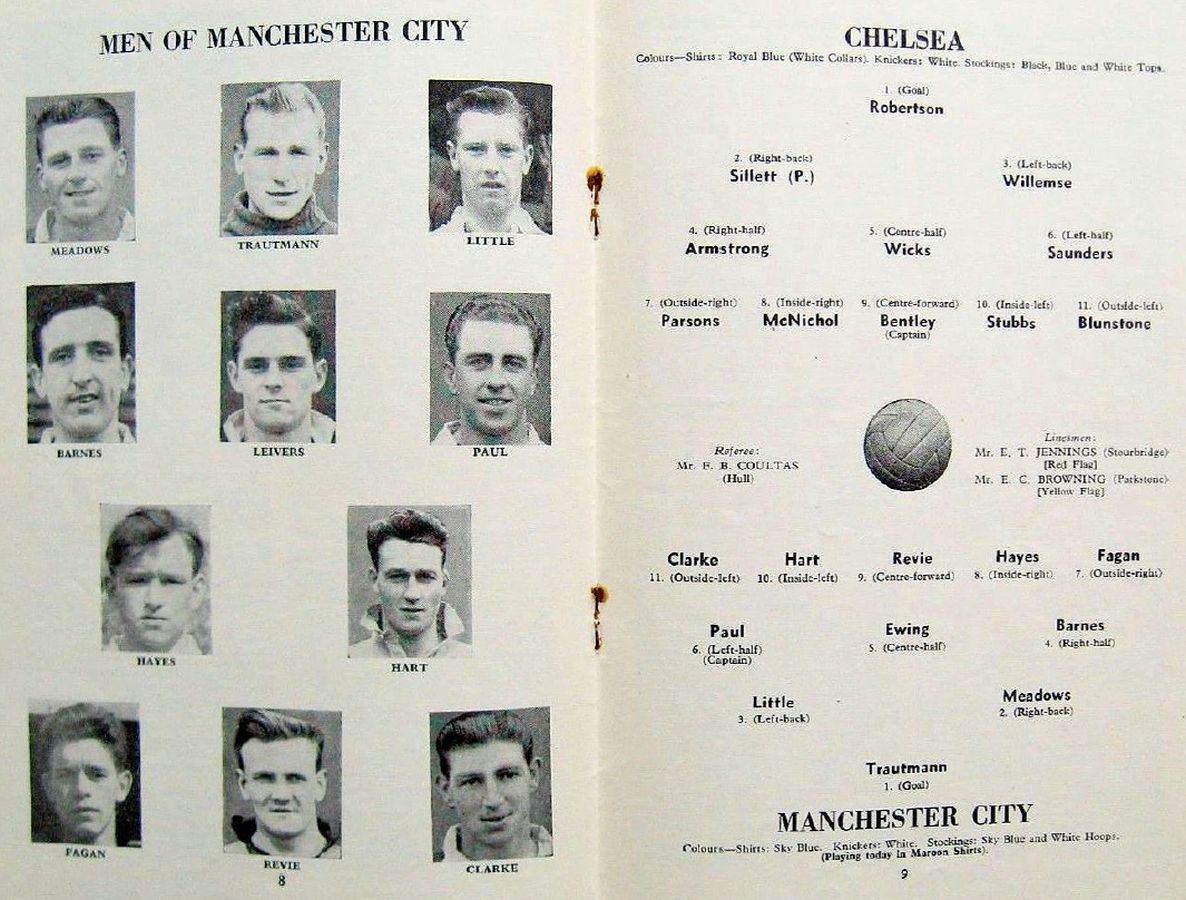 Bert Trautmann, Jimmy Meadows, Roy Little, Ken Barnes, Dave Ewing, Roy Paul, Paddy Fagan, Billy McAdams, Don Revie, Johnny Hart, Roy Clarke |