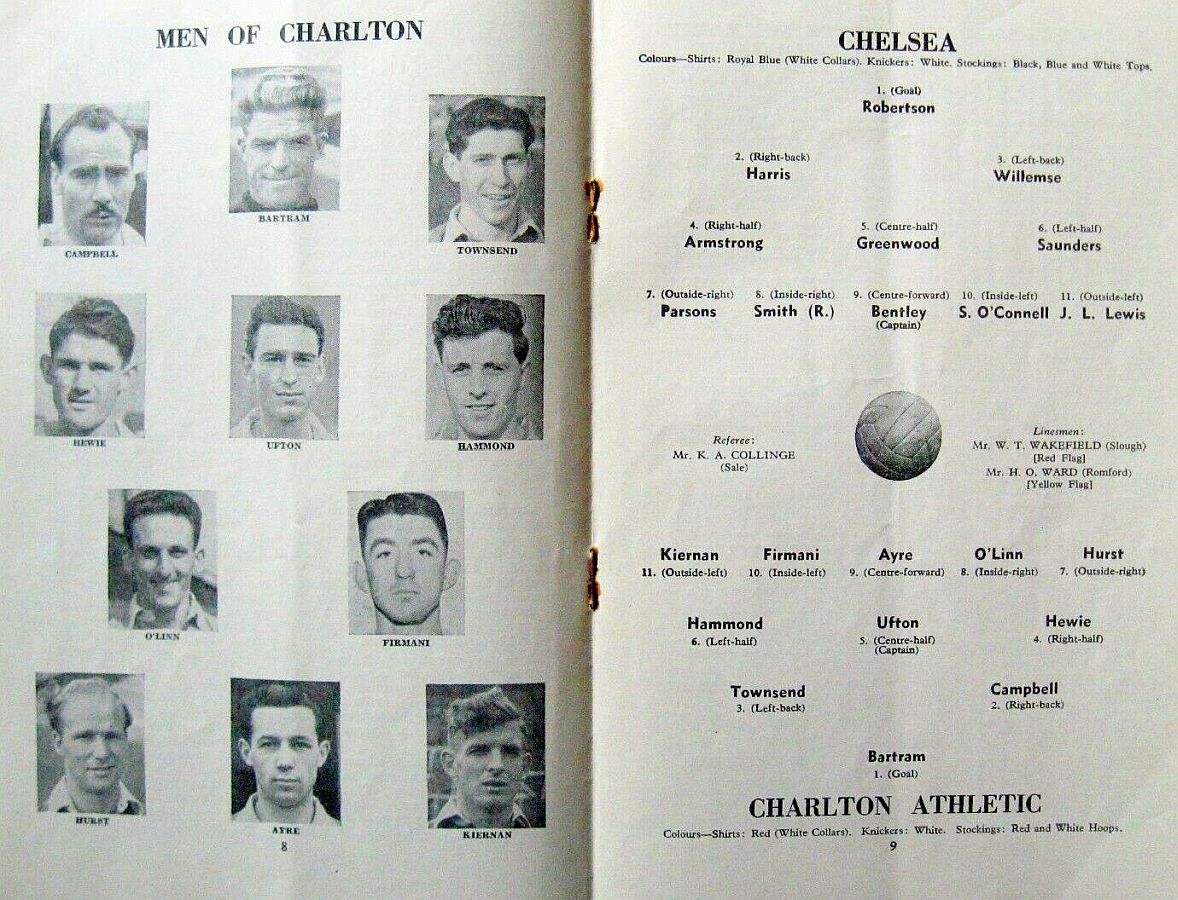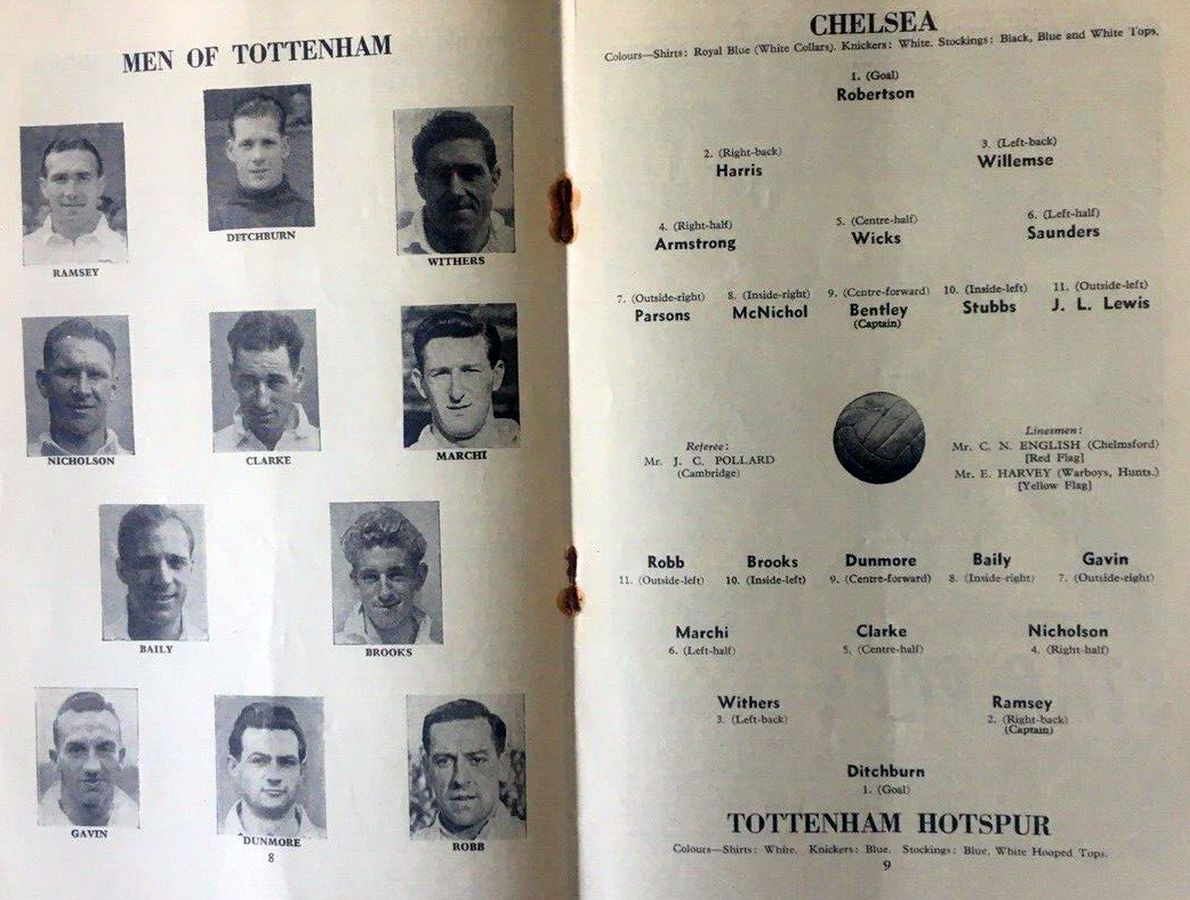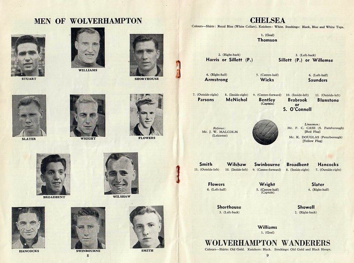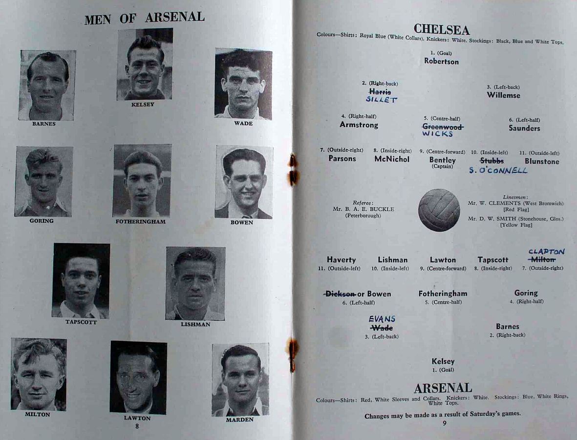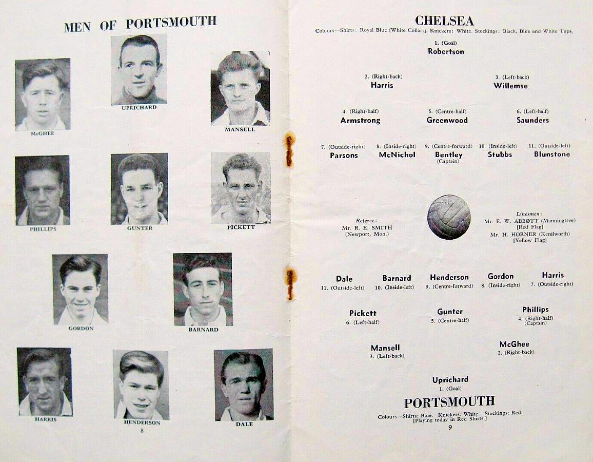 1 Chick Thomson, 2 John Harris, 3 Peter Sillett, 4 Ken Armstrong, 5 Stan Wicks, 6 Derek Saunders, 7 Eric Parsons, 8 Johnny McNichol, 9 Roy Bentley, 10 Peter Brabrook, 11 Stan Willemse |