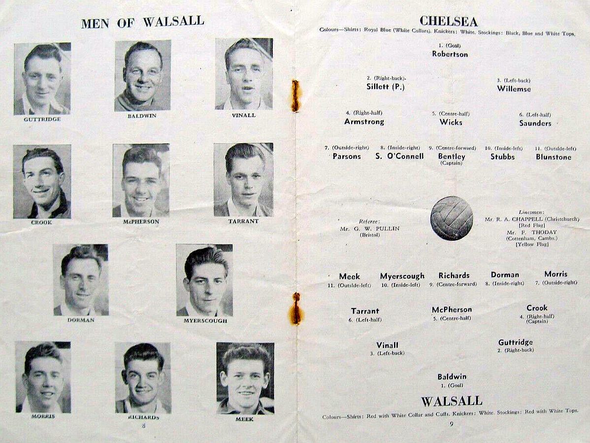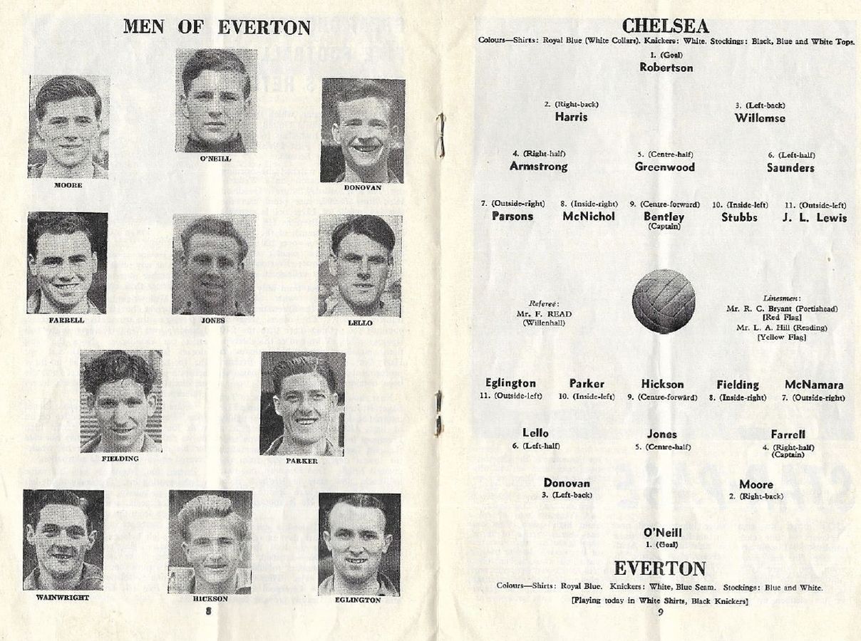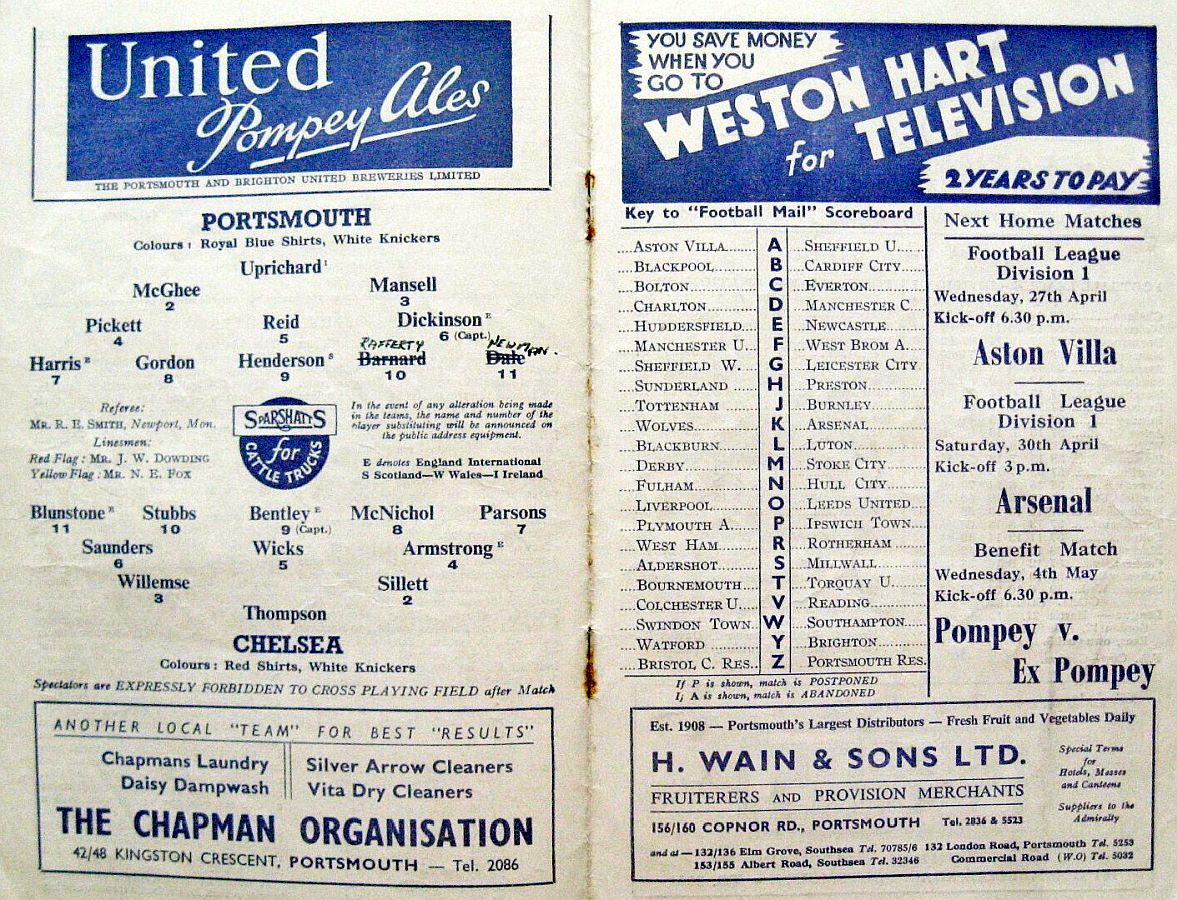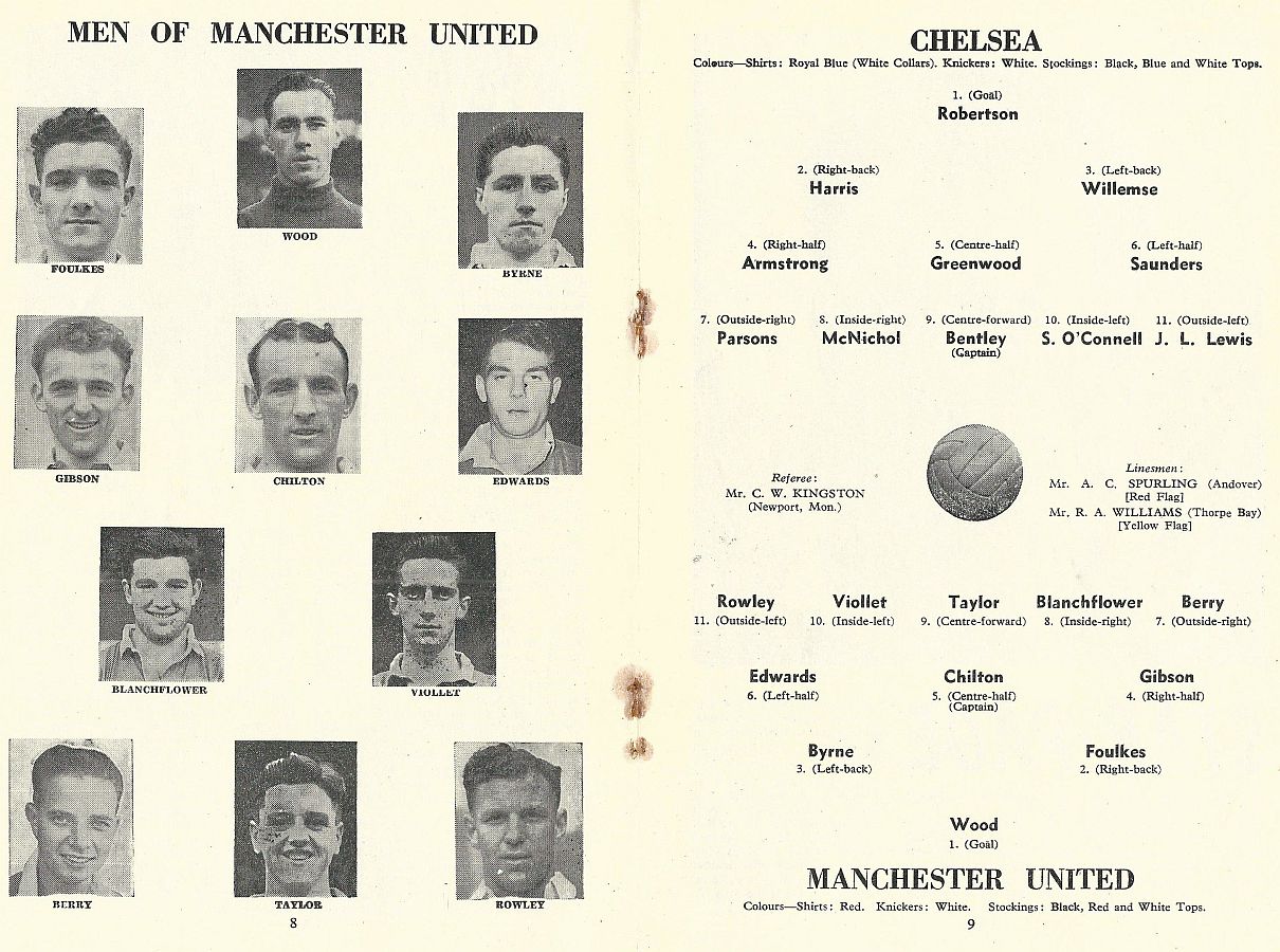 1 Chick Thomson, 2 John Harris, 3 Peter Sillett, 4 Ken Armstrong, 5 Stan Wicks, 6 Derek Saunders, 7 Eric Parsons, 8 Johnny McNichol, 9 Roy Bentley, 10 Peter Brabrook, 11 Stan Willemse |