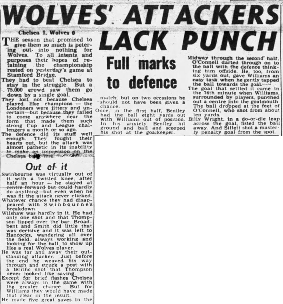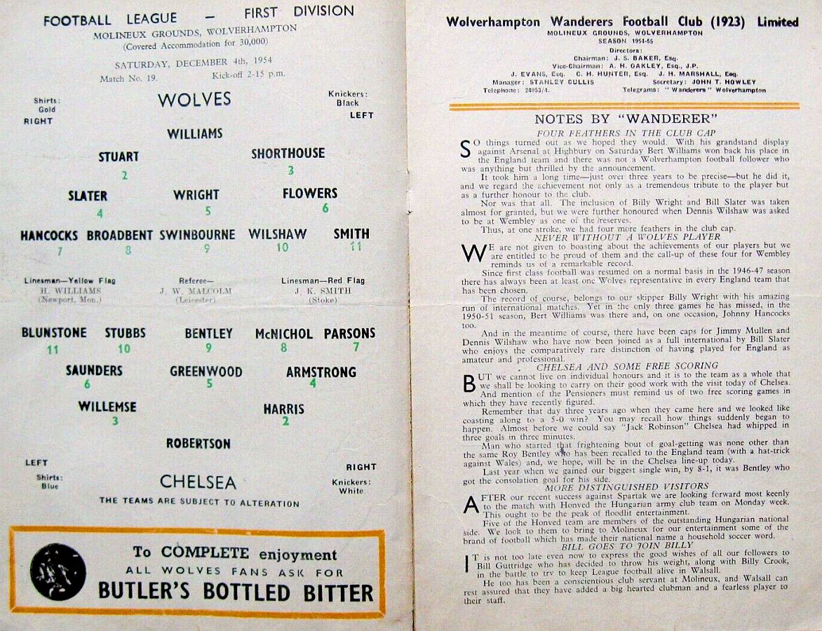 Bert Williams, George Showell, Bill Shorthouse, Bill Slater, Billy Wright, Ron Flowers, Johnny Hancocks, Peter Broadbent, Roy Swinbourne, Dennis Wilshaw, Les Smith |