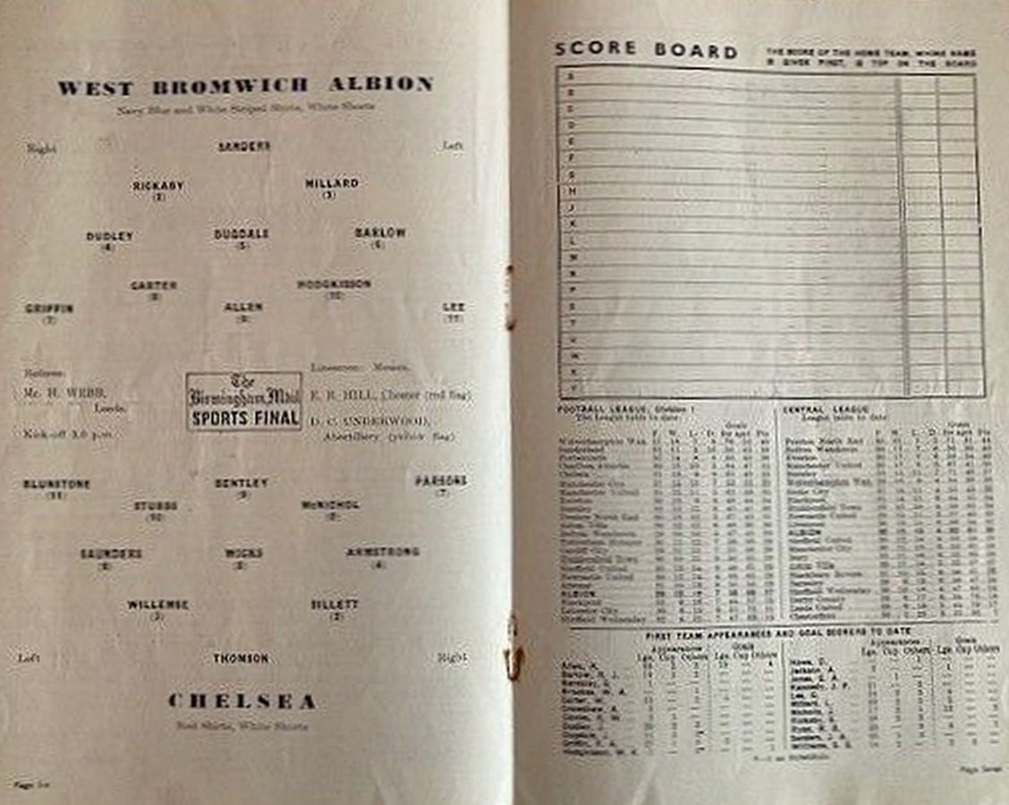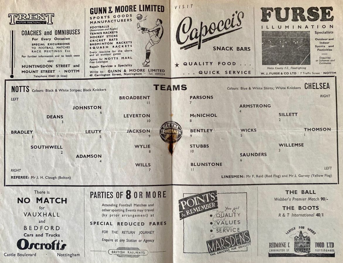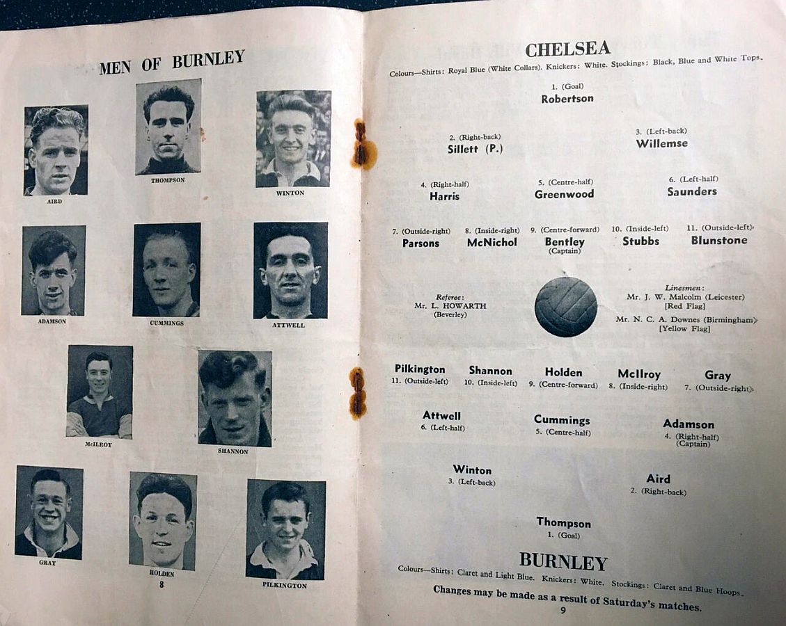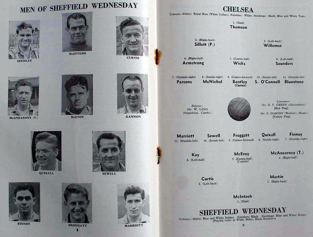 1 Chick Thomson, 2 John Harris, 3 Peter Sillett, 4 Ken Armstrong, 5 Stan Wicks, 6 Derek Saunders, 7 Eric Parsons, 8 Johnny McNichol, 9 Roy Bentley, 10 Les Stubbs, 11 Frank Blunstone |