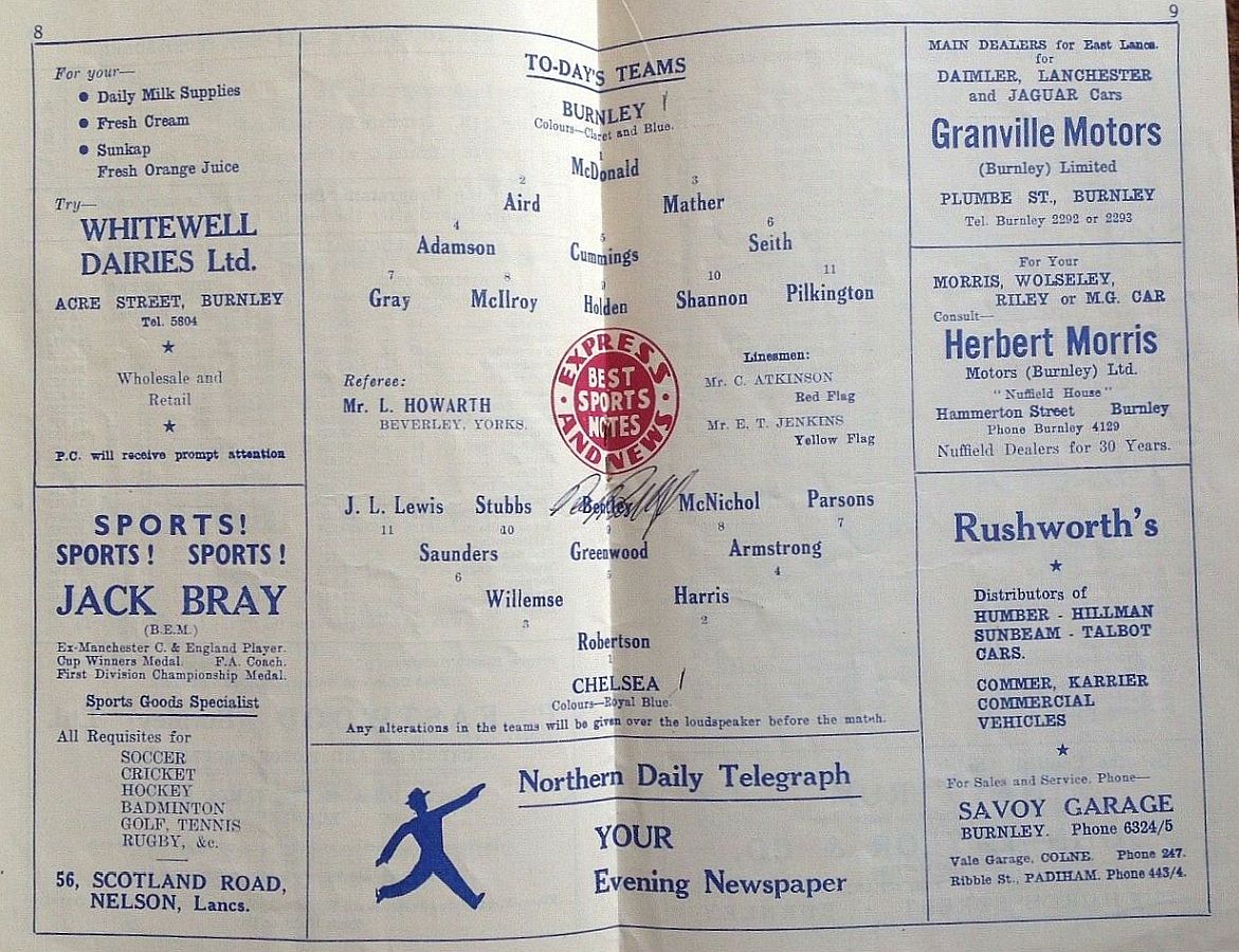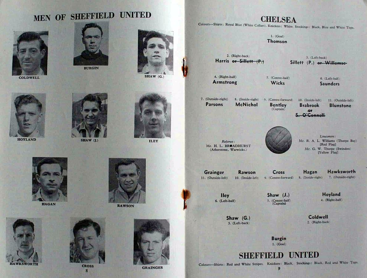 1 Chick Thomson, 2 John Harris, 3 Peter Sillett, 4 Ken Armstrong, 5 Stan Wicks, 6 Derek Saunders, 7 Eric Parsons, 8 Johnny McNichol, 9 Roy Bentley, 10 Seamus O'Connell, 11 Frank Blunstone |