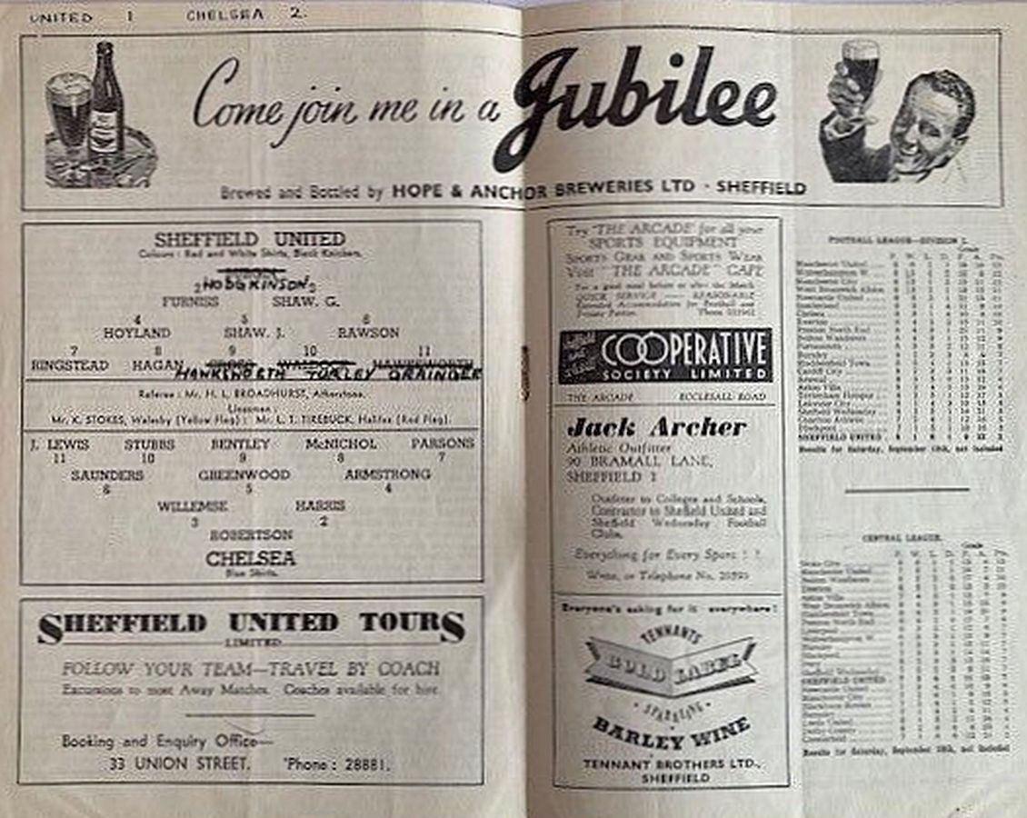 Johnny Anderson, Stan Milburn, Ron Jackson, Jimmy Baldwin, Matt Gillies, Eddie Russell, Mal Griffiths, Johnny Morris, Derek Hines, Arthur Rowley, Jack Froggatt |