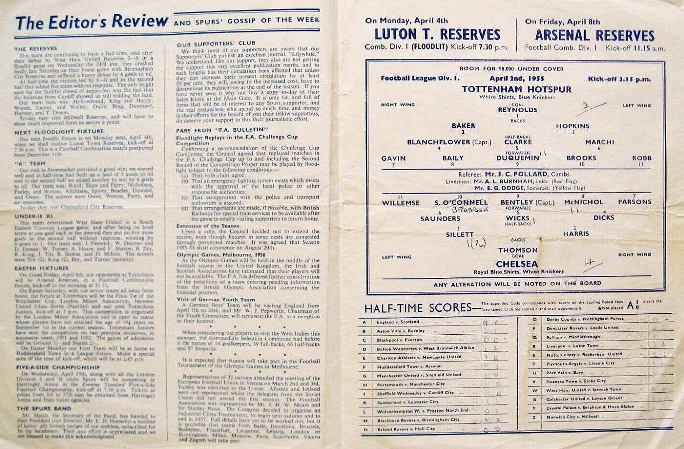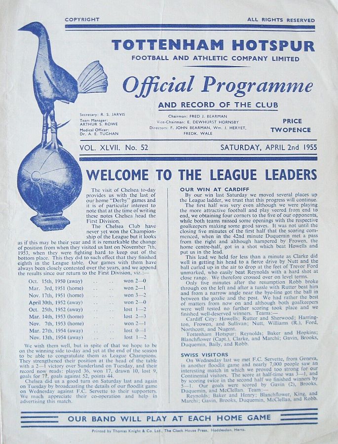 Ron Reynolds, Peter Baker, Mel Hopkins, Danny Blanchflower, Harry Clarke, Tony Marchi, Johnny Gavin, Eddie Baily, Len Duquemin, Johnny Brooks, George Robb |