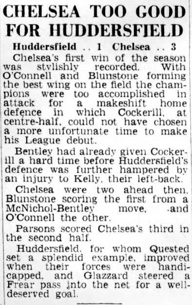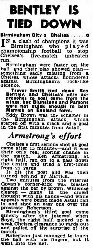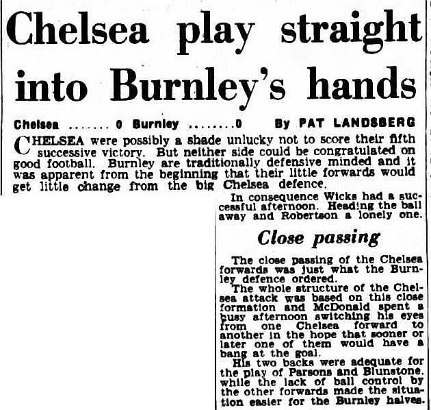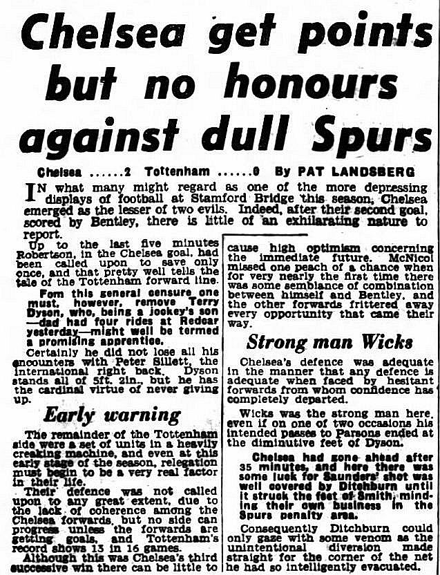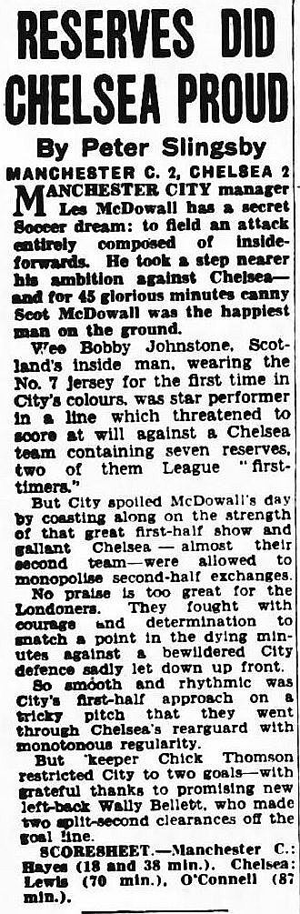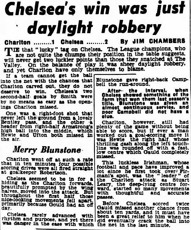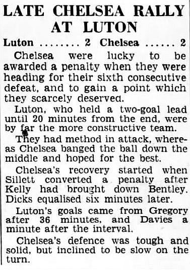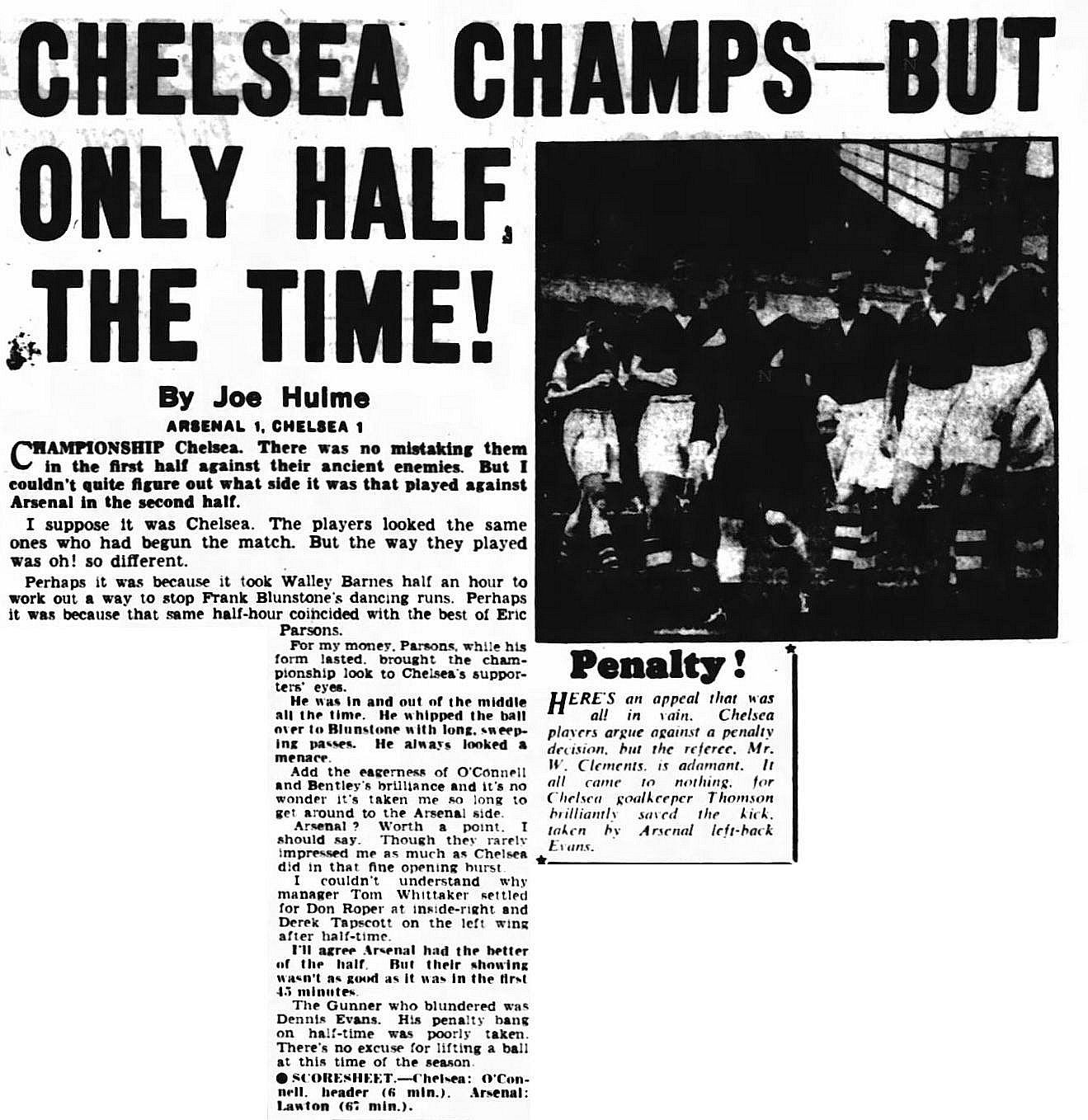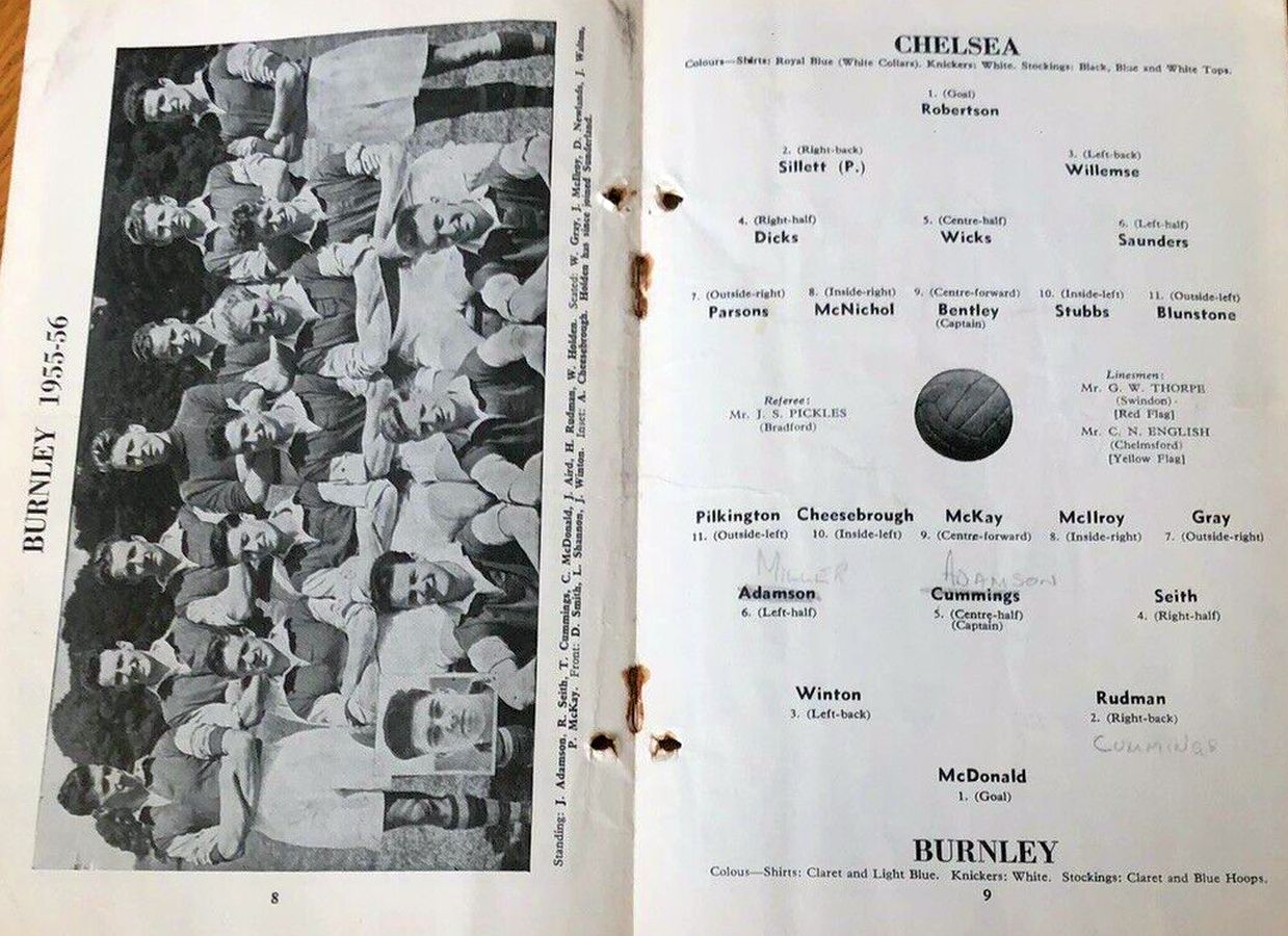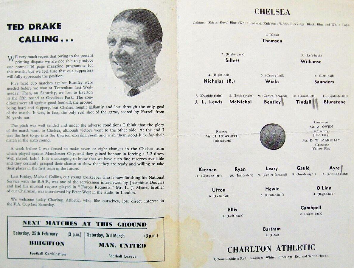1 Bill Robertson, 2 Peter Sillett, 3 Stan Willemse, 4 Ken Armstrong, 5 Stan Wicks, 6 Derek Saunders, 7 Eric Parsons, 8 Peter Brabrook, 9 Roy Bentley, 10 Les Stubbs, 11 Frank Blunstone |